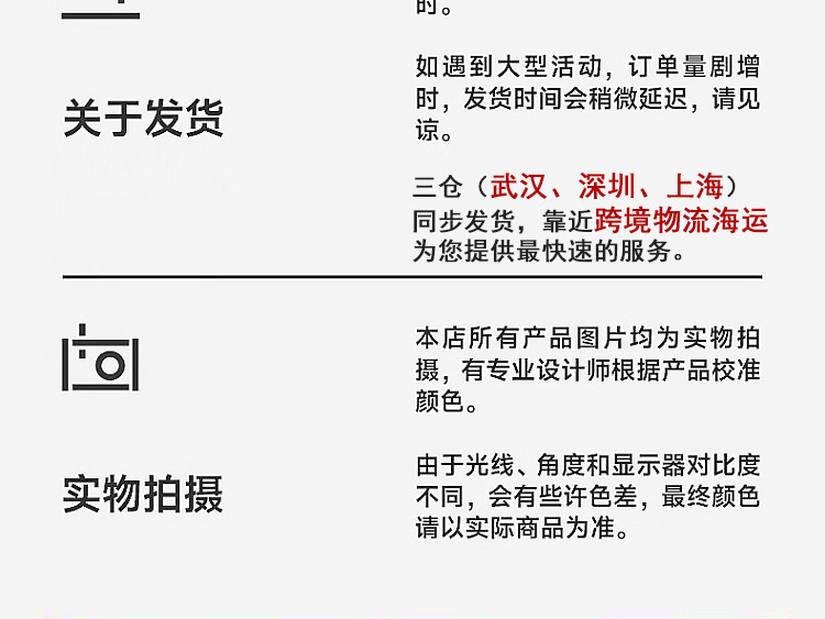 弊社が取り扱っている商品は、自社の海外工場から直送しています。ご入金が確認でき次第に商品を発送いたします。ご注文殺到時や、ご注文数量、種類が多い場合は、発送が遅れる可能性がございます、ご了承ください。ご注文商品の中に在庫がない商品につき、その商品のみキャンセルさせていただき、在庫のある商品のみをまとめて発送させていただきます。また、ご注文後の商品追加や、内容変更、同梱などはお受付しておりません。