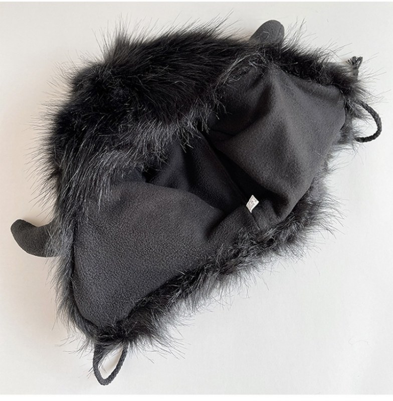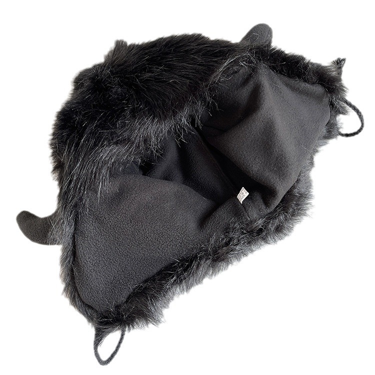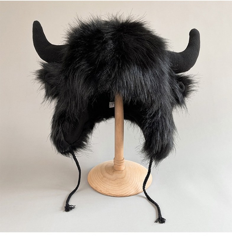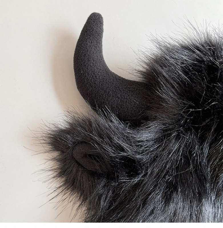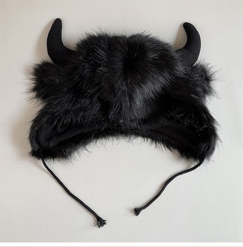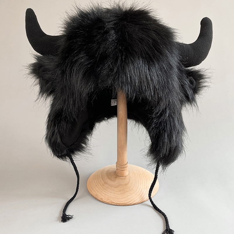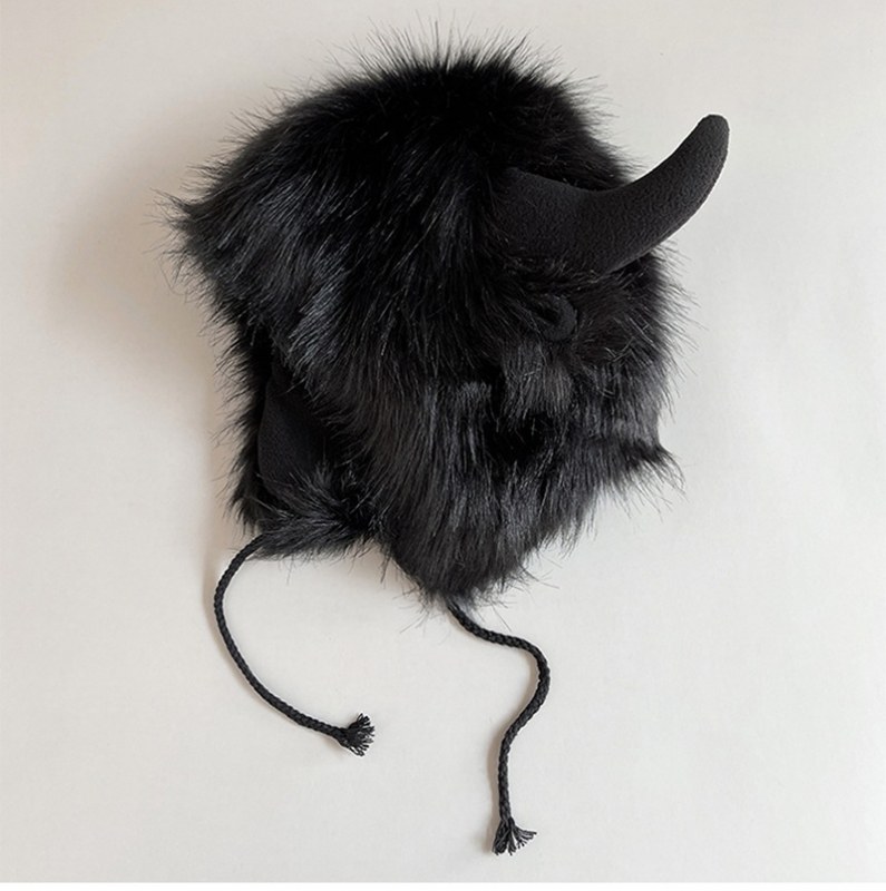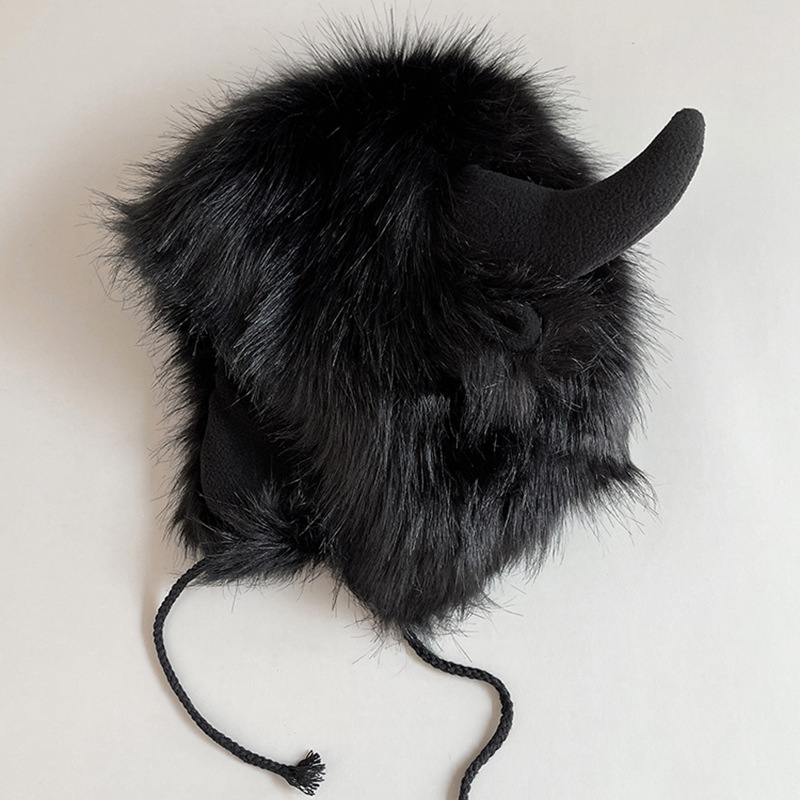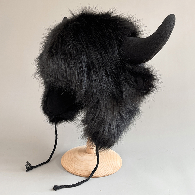 • ハロウィン装飾雄牛魔王大きな黒い牛の毛雷峰帽子男性と女性のための冬暖かい人格面白い牛頭帽子