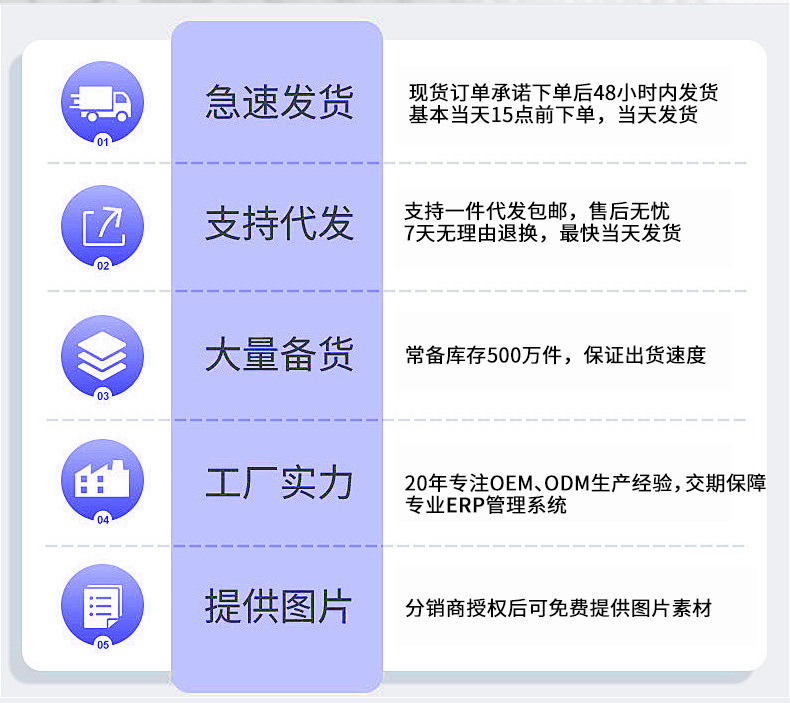 弊社が取り扱っている商品は、自社の海外工場から直送しています。ご入金が確認でき次第に商品を発送いたします。ご注文殺到時や、ご注文数量、種類が多い場合は、発送が遅れる可能性がございます、ご了承ください。ご注文商品の中に在庫がない商品につき、その商品のみキャンセルさせていただき、在庫のある商品のみをまとめて発送させていただきます。また、ご注文後の商品追加や、内容変更、同梱などはお受付しておりません。
