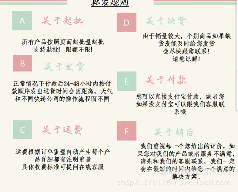 弊社が取り扱っている商品は、自社の海外工場から直送しています。ご入金が確認でき次第に商品を発送いたします。ご注文殺到時や、ご注文数量、種類が多い場合は、発送が遅れる可能性がございます、ご了承ください。ご注文商品の中に在庫がない商品につき、その商品のみキャンセルさせていただき、在庫のある商品のみをまとめて発送させていただきます。また、ご注文後の商品追加や、内容変更、同梱などはお受付しておりません。
