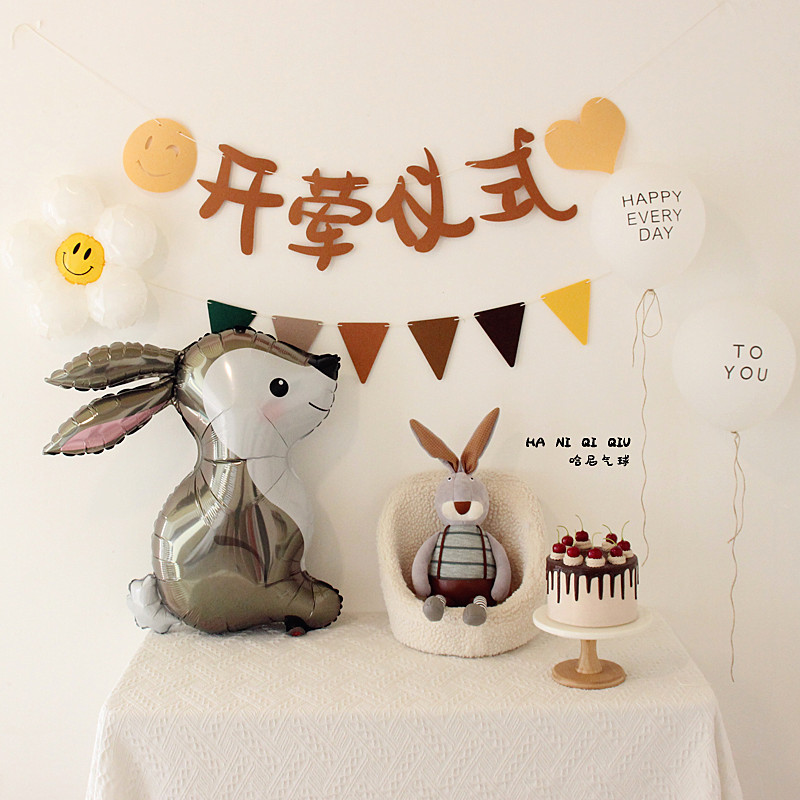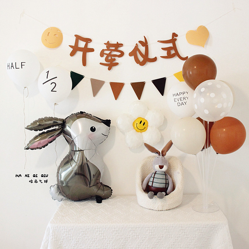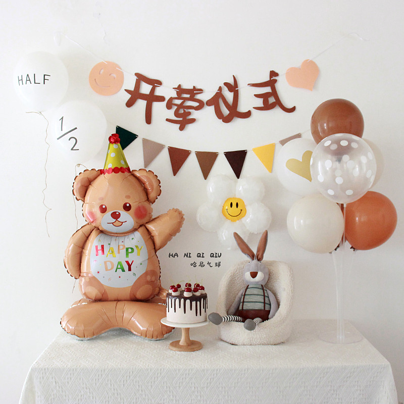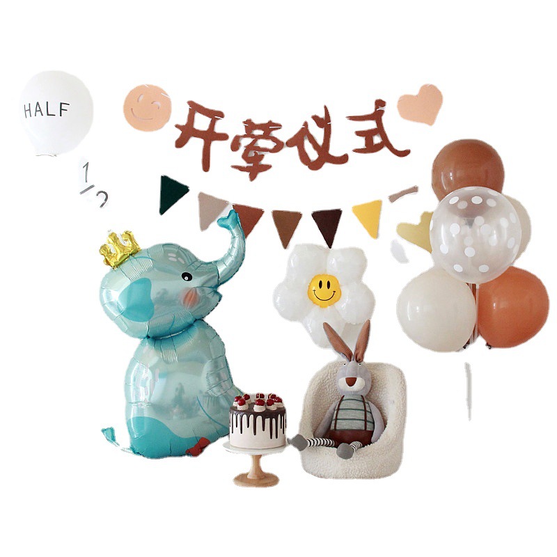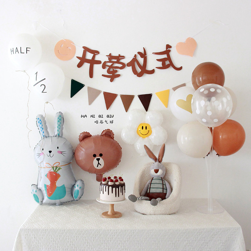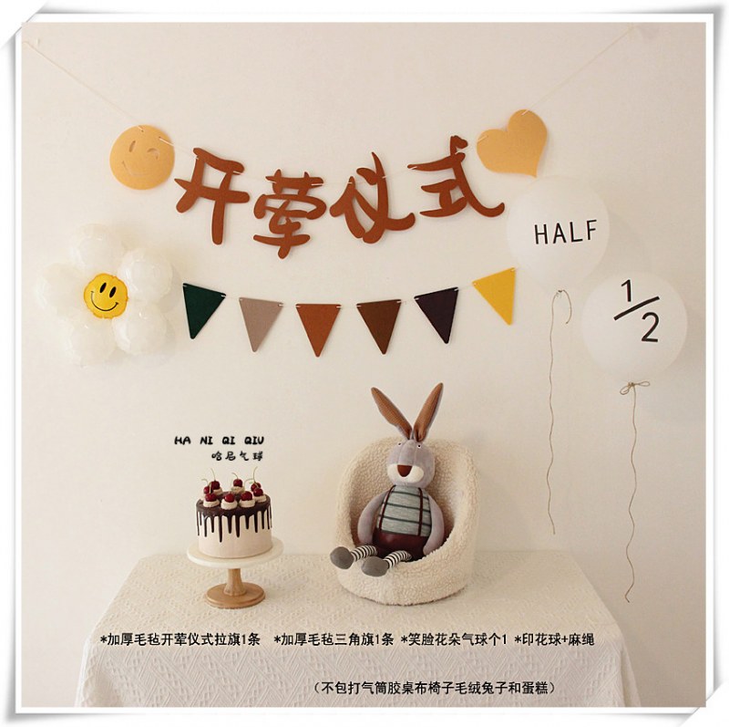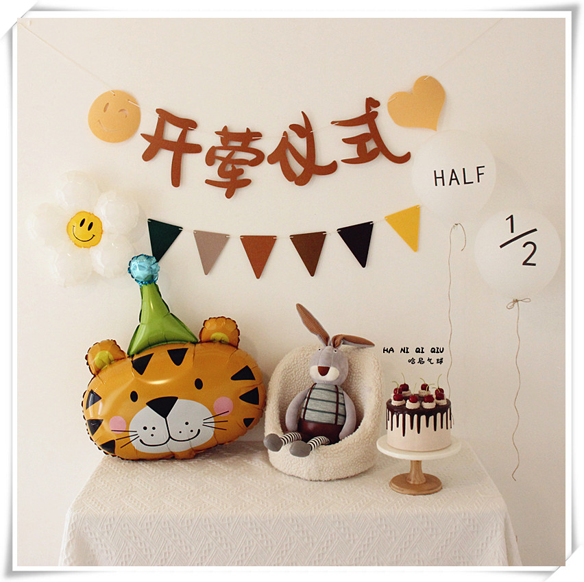 • 森風赤ちゃんの肉食セレモニーレイアウト、旗背景、生後半年・生後6ヶ月の誕生日バルーンシーン装飾