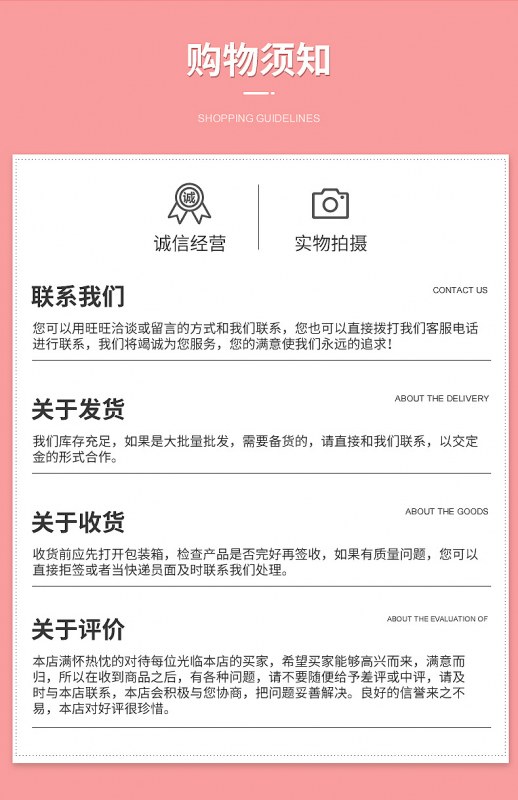 弊社が取り扱っている商品は、自社の海外工場から直送しています。ご入金が確認でき次第に商品を発送いたします。ご注文殺到時や、ご注文数量、種類が多い場合は、発送が遅れる可能性がございます、ご了承ください。ご注文商品の中に在庫がない商品につき、その商品のみキャンセルさせていただき、在庫のある商品のみをまとめて発送させていただきます。また、ご注文後の商品追加や、内容変更、同梱などはお受付しておりません。