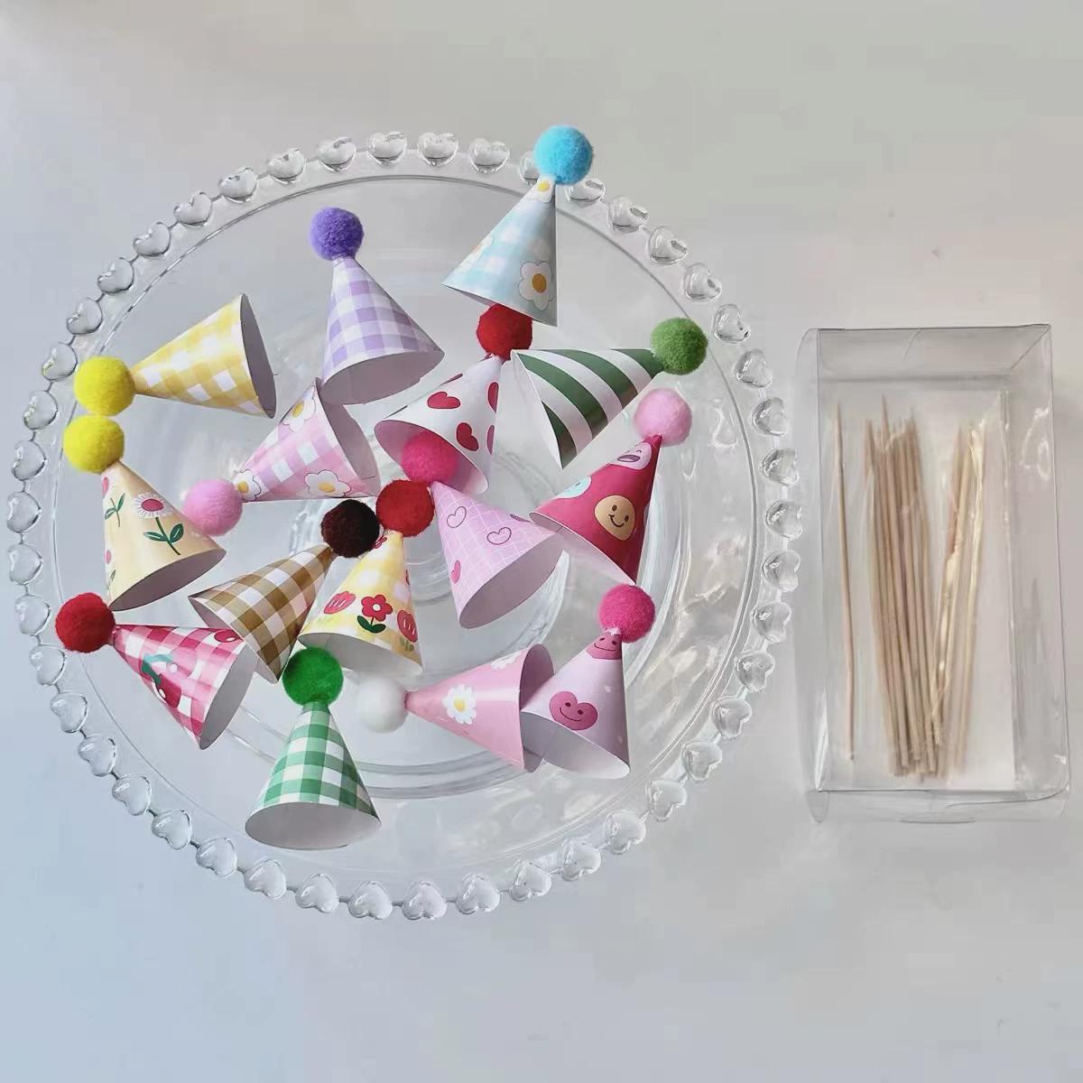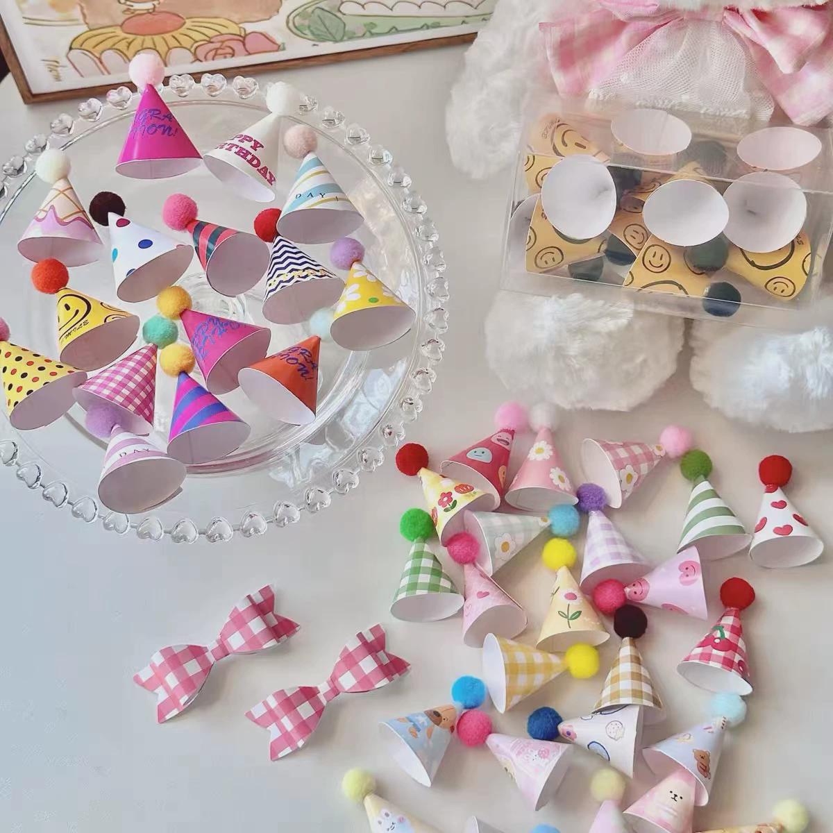 • 韓国インスタイルレトロケーキデコレーションオーナメントカラフルなチェック柄スマイリーファーファンあなたの誕生日帽子プラグイン