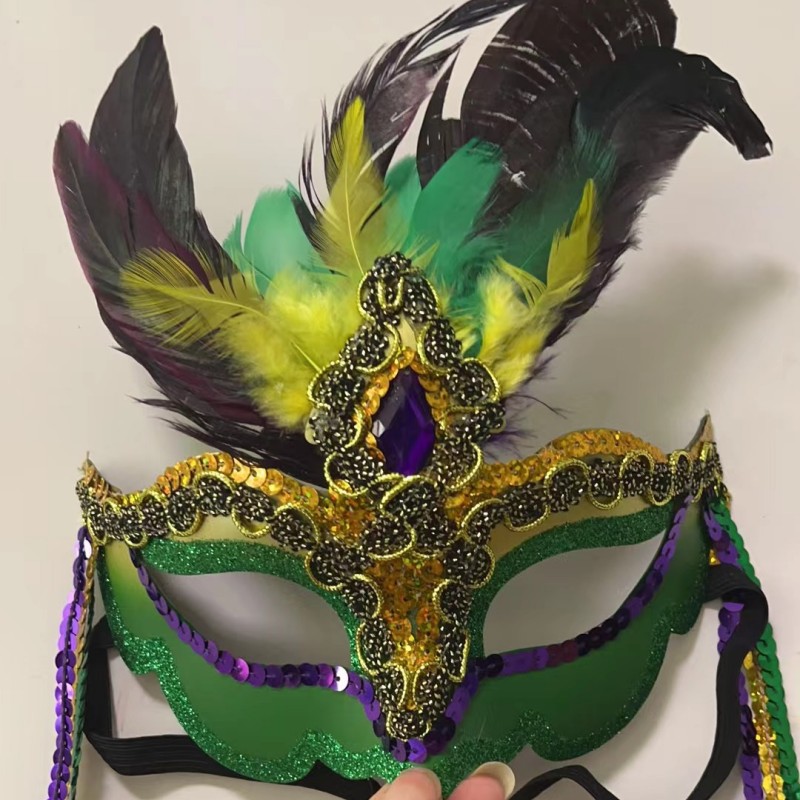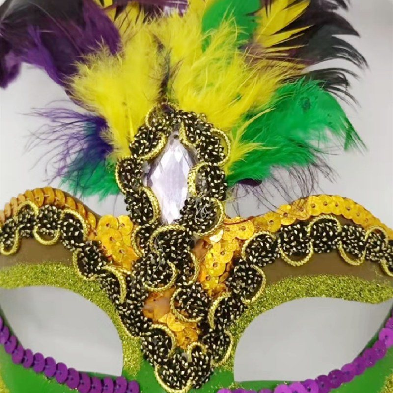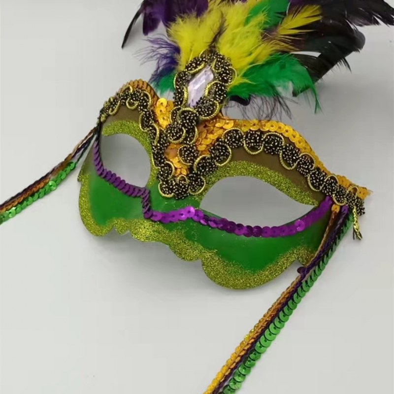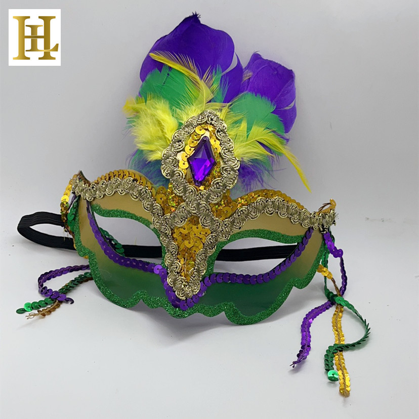 • 熱い販売プロムフェザー塗装ダスティングピンクゴールドグリーンパープルタッセルマスクカーニバルパーティーマルディグラマスク