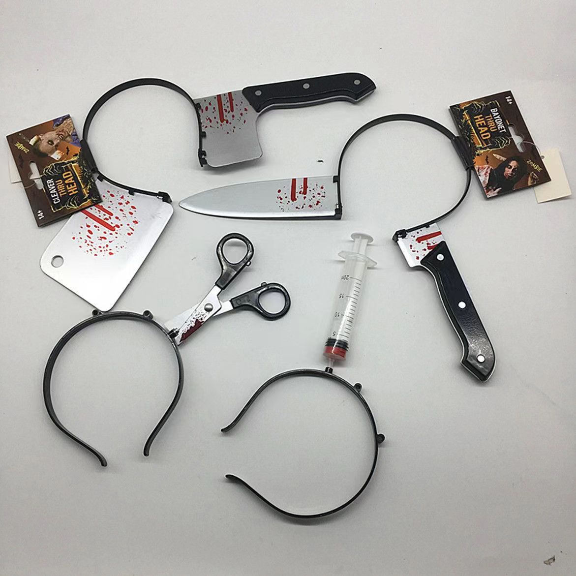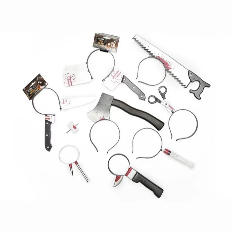 • ハロウィーンの頭を突き刺すナイフのトリック、面白いホラー帽子、なりすまし小道具、模擬包丁の鋭いナイフ、斧、注射器ヘッドバンド