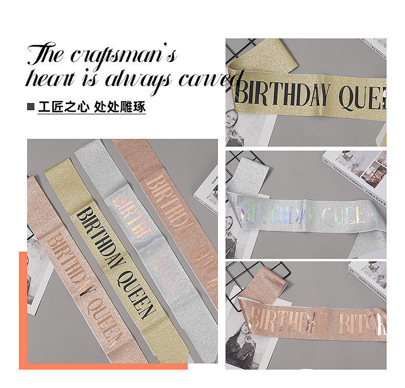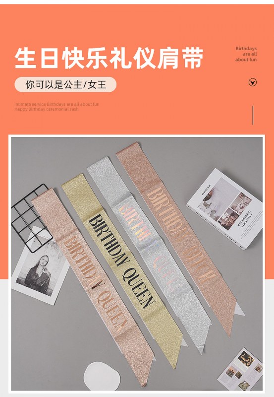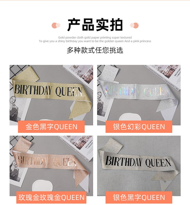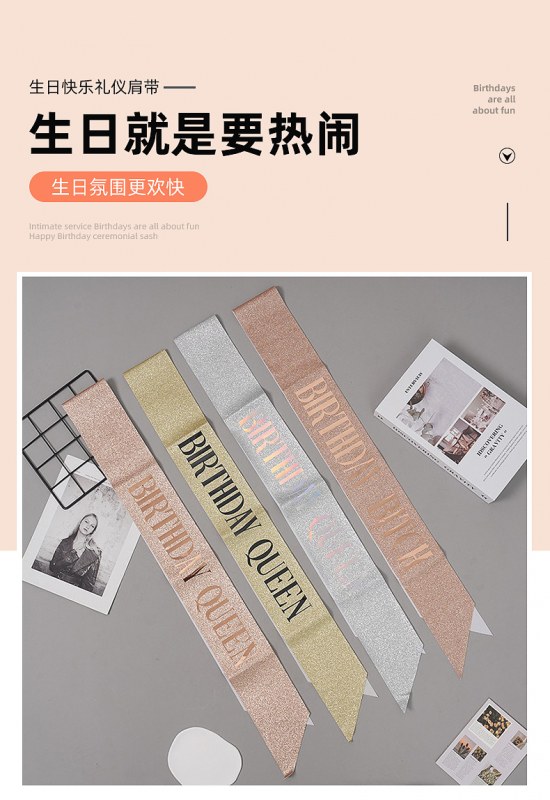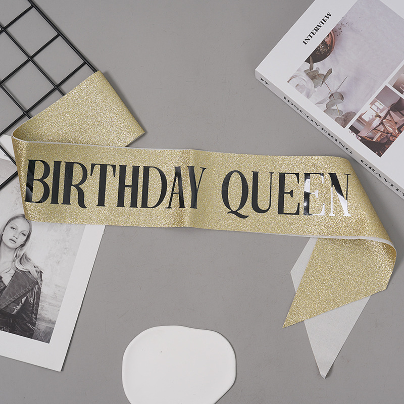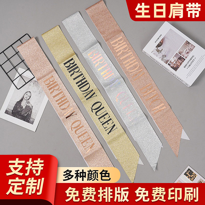 • 卸売新しい誕生日パーティーアクセサリーホリデーショルダーストラップシャンパンカラーホットスタンプBIRTHDAN QUEENエチケットストラップ