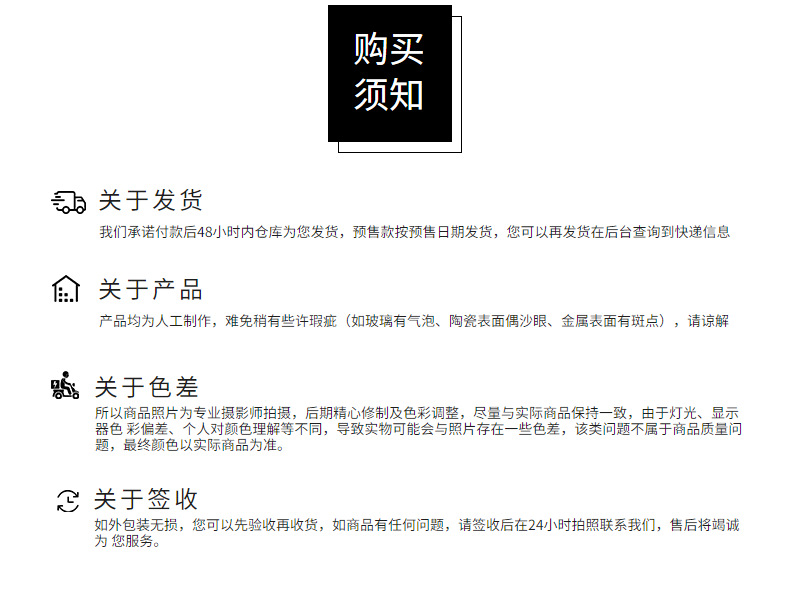 弊社が取り扱っている商品は、自社の海外工場から直送しています。ご入金が確認でき次第に商品を発送いたします。ご注文殺到時や、ご注文数量、種類が多い場合は、発送が遅れる可能性がございます、ご了承ください。ご注文商品の中に在庫がない商品につき、その商品のみキャンセルさせていただき、在庫のある商品のみをまとめて発送させていただきます。また、ご注文後の商品追加や、内容変更、同梱などはお受付しておりません。