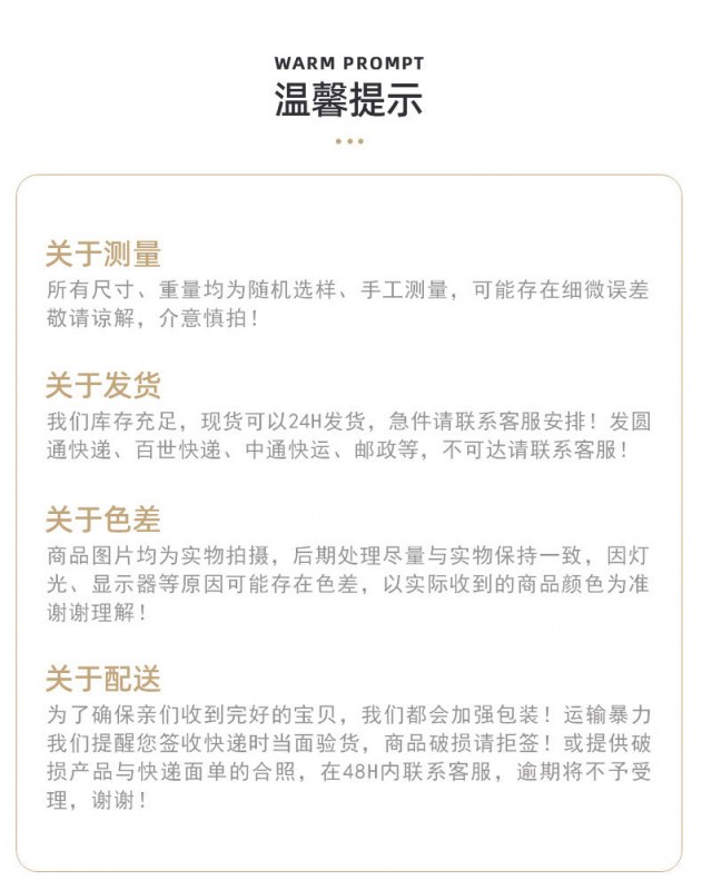 弊社が取り扱っている商品は、自社の海外工場から直送しています。ご入金が確認でき次第に商品を発送いたします。ご注文殺到時や、ご注文数量、種類が多い場合は、発送が遅れる可能性がございます、ご了承ください。ご注文商品の中に在庫がない商品につき、その商品のみキャンセルさせていただき、在庫のある商品のみをまとめて発送させていただきます。また、ご注文後の商品追加や、内容変更、同梱などはお受付しておりません。