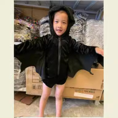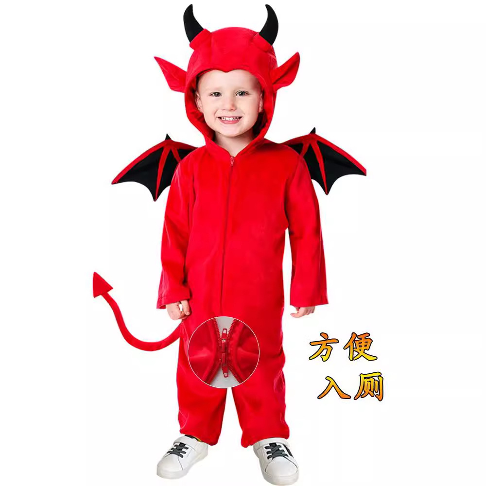 • ハロウィーンの子供用服の男性と女の子のキャラクターはかわいい小さな悪魔のコウモリを演奏します