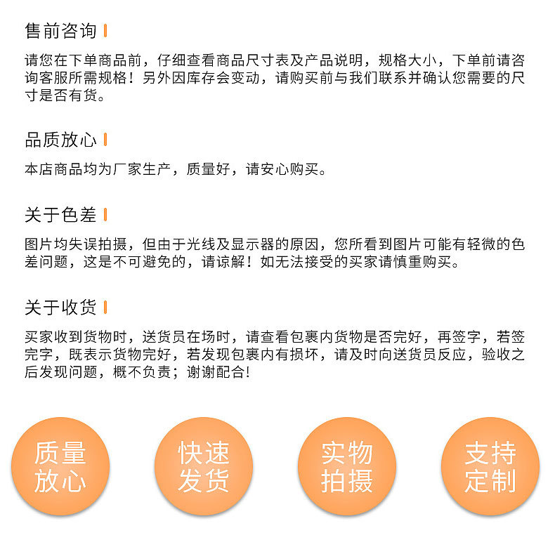 弊社が取り扱っている商品は、自社の海外工場から直送しています。ご入金が確認でき次第に商品を発送いたします。ご注文殺到時や、ご注文数量、種類が多い場合は、発送が遅れる可能性がございます、ご了承ください。ご注文商品の中に在庫がない商品につき、その商品のみキャンセルさせていただき、在庫のある商品のみをまとめて発送させていただきます。また、ご注文後の商品追加や、内容変更、同梱などはお受付しておりません。