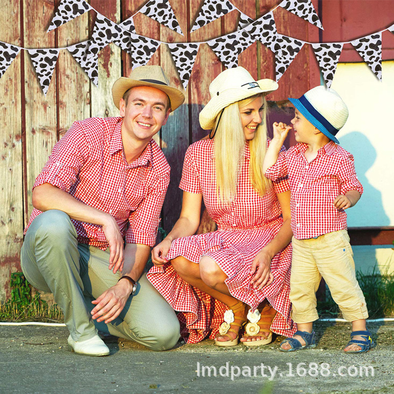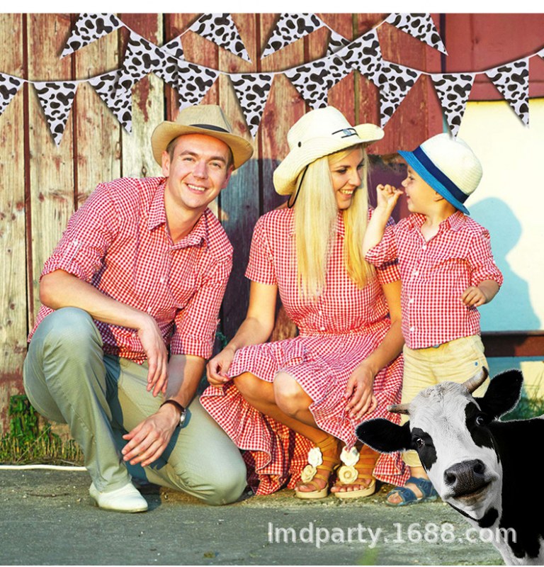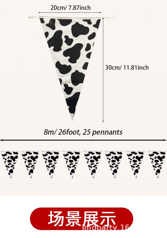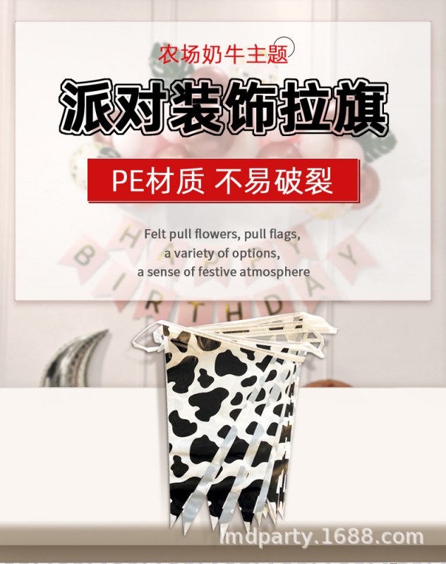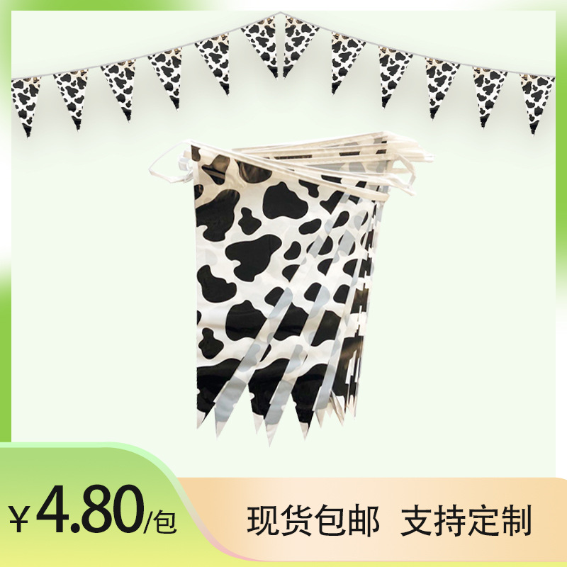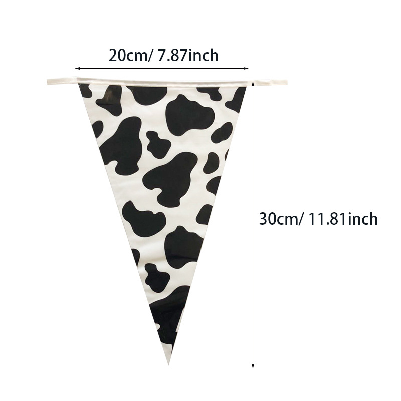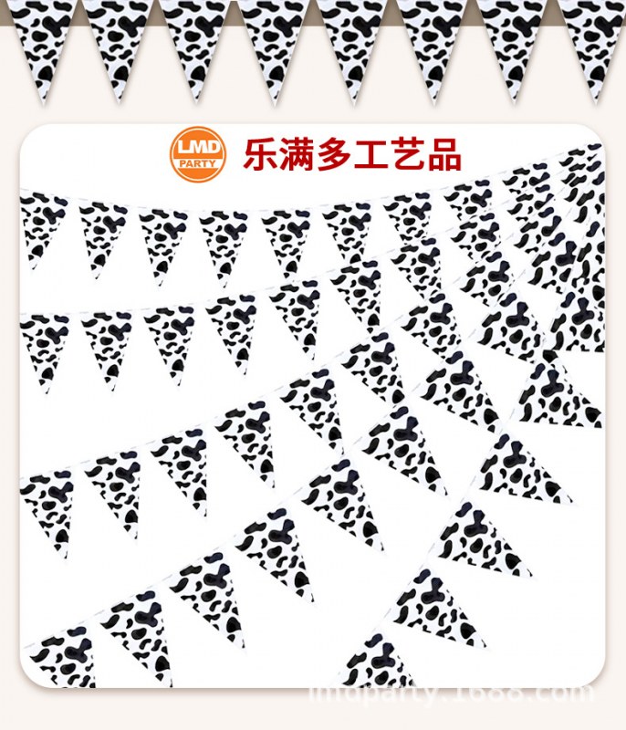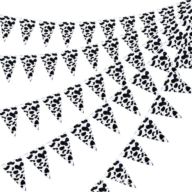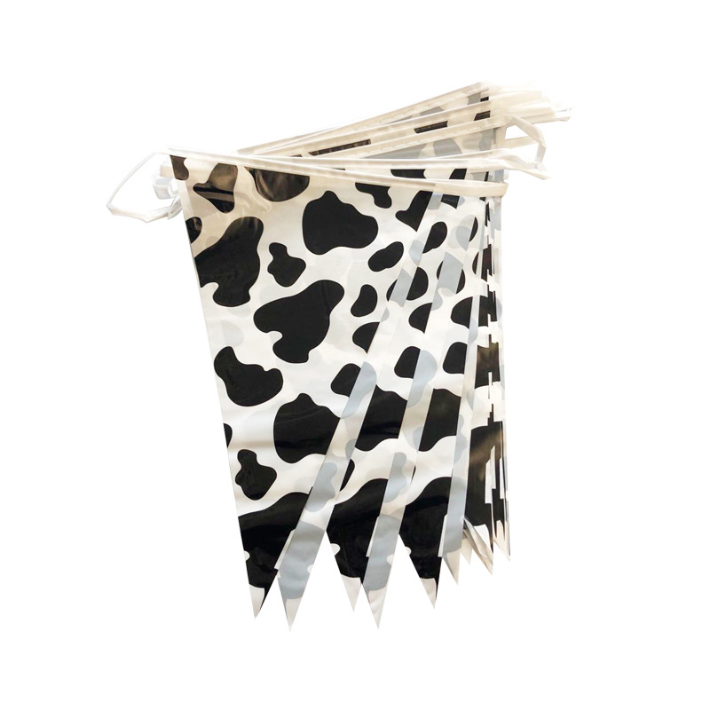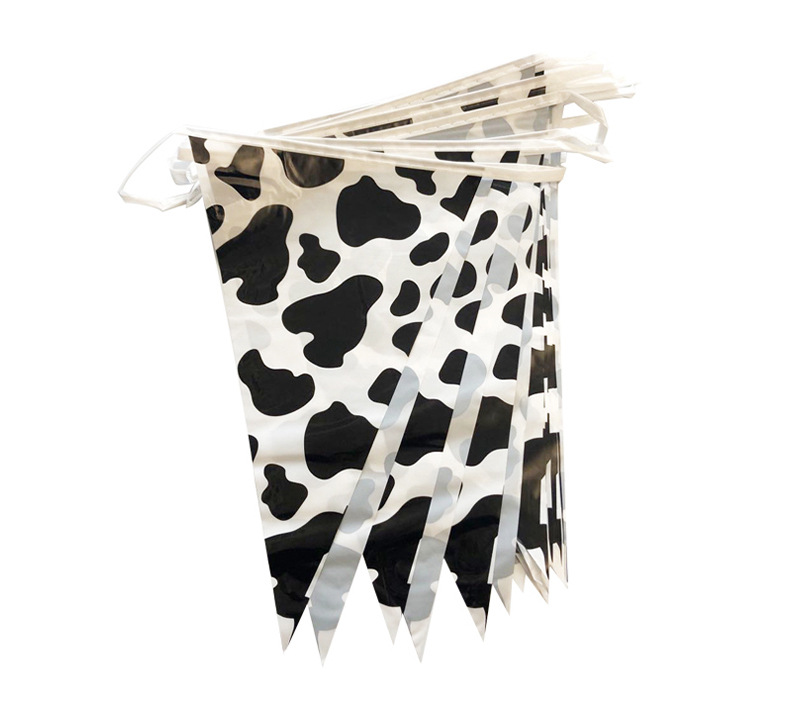 • ファームテーマの誕生日パーティーの装飾 PE ストリングフラグ牛黒と白のストライプの誕生日シーンの装飾用品