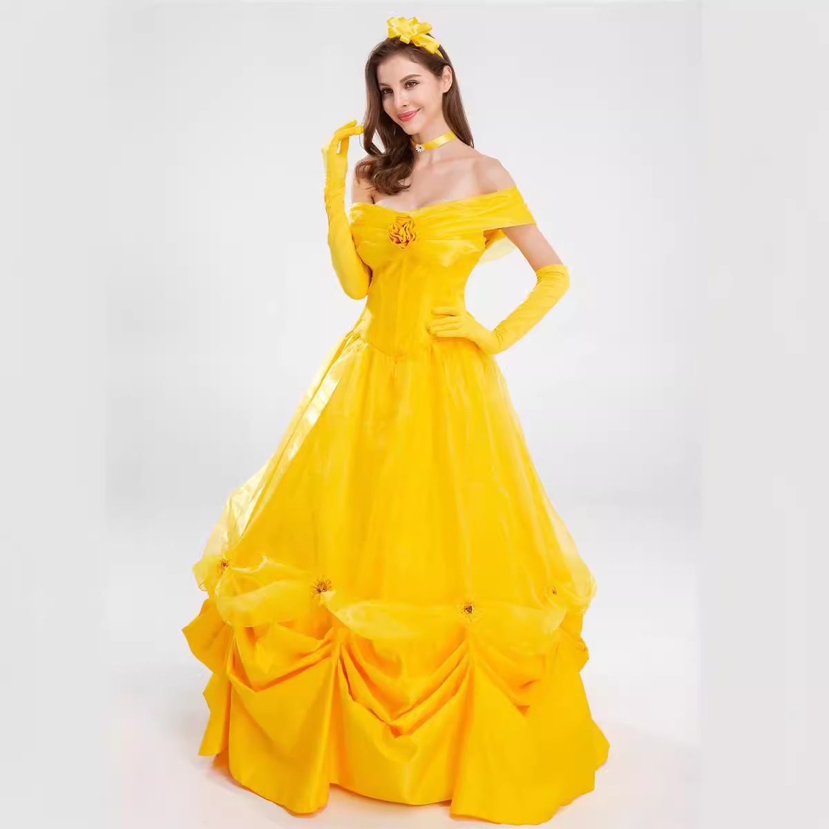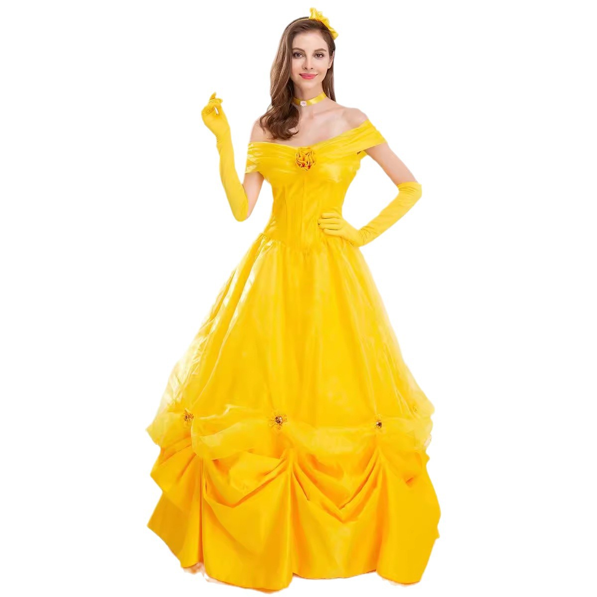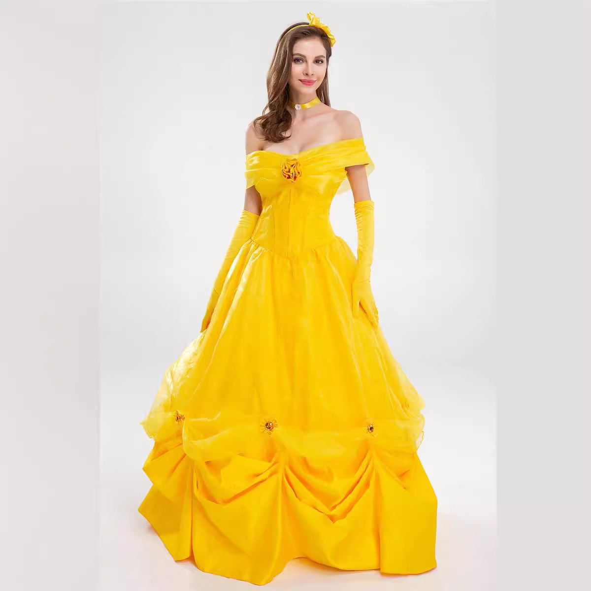 • ハロウィン COS 美女と野獣 おとぎ話 劇 プリンセス ベル 大人 女性 イエロー ロングドレス パーティーコスチューム