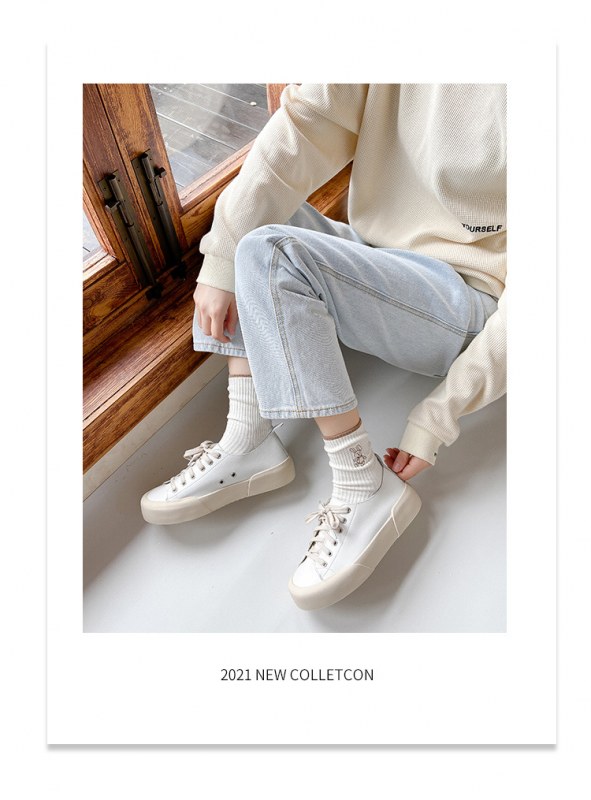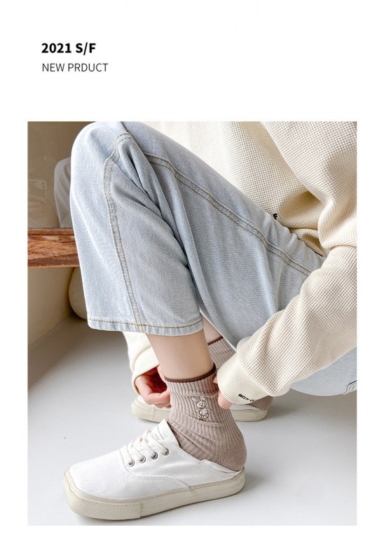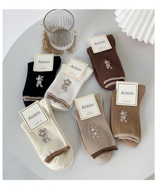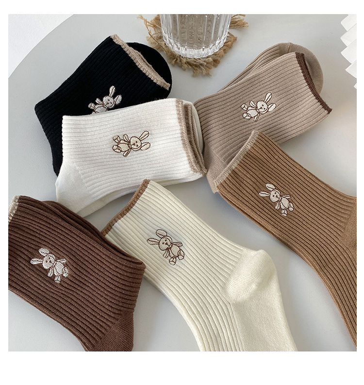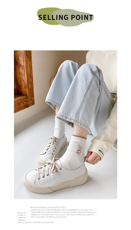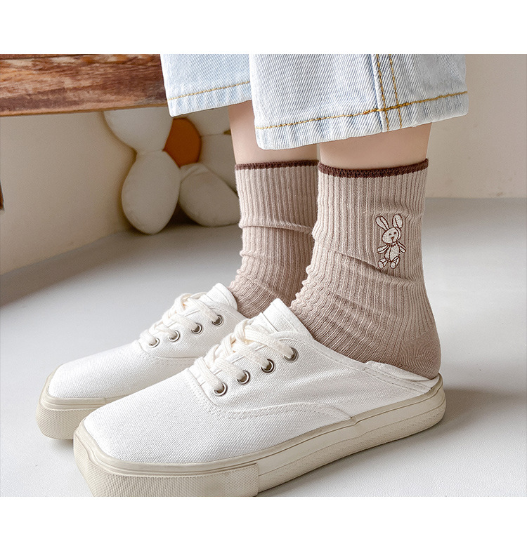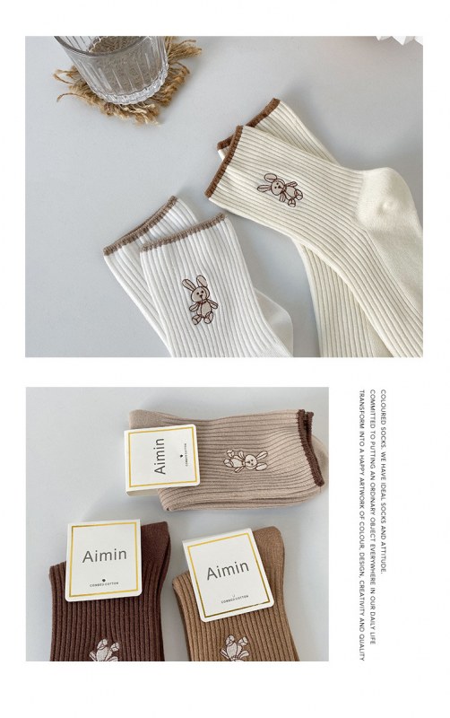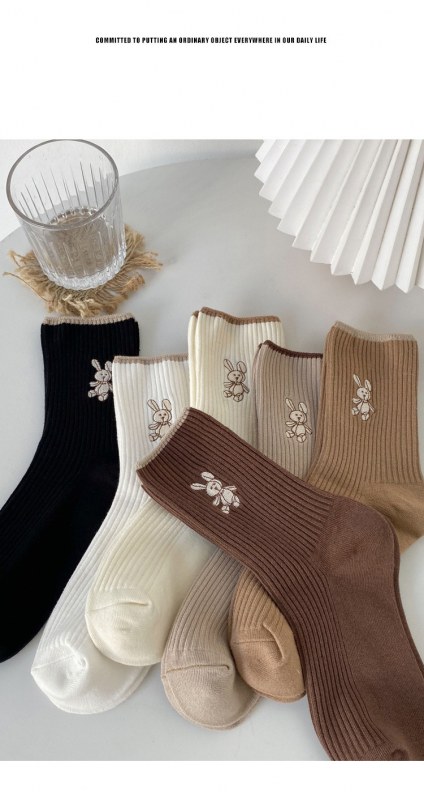 • 女性用靴下イントレンディな秋と冬の新しい綿のかわいい日本のミッドカーフソックス無地の薄いストリップ刺繍バニーパイルソックス
