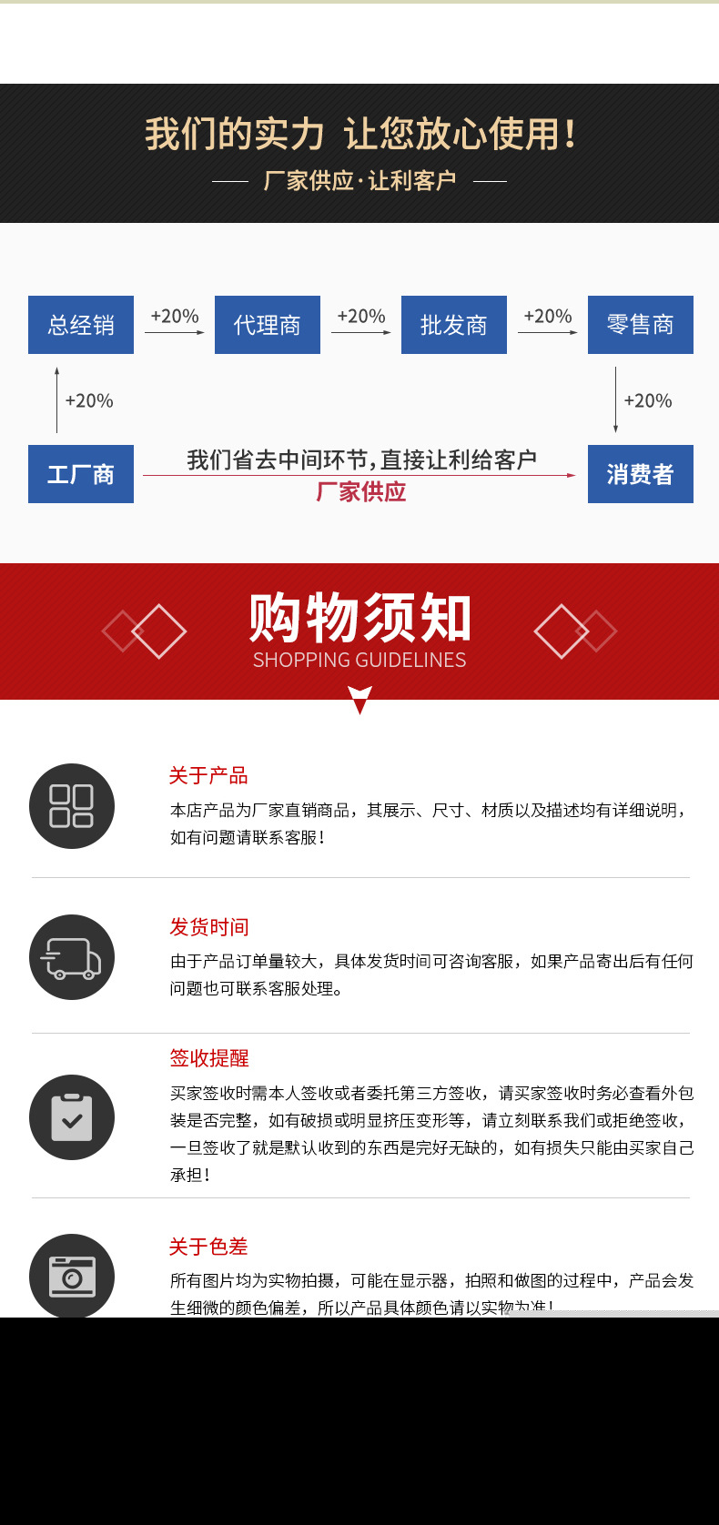 弊社が取り扱っている商品は、自社の海外工場から直送しています。ご入金が確認でき次第に商品を発送いたします。ご注文殺到時や、ご注文数量、種類が多い場合は、発送が遅れる可能性がございます、ご了承ください。ご注文商品の中に在庫がない商品につき、その商品のみキャンセルさせていただき、在庫のある商品のみをまとめて発送させていただきます。また、ご注文後の商品追加や、内容変更、同梱などはお受付しておりません。