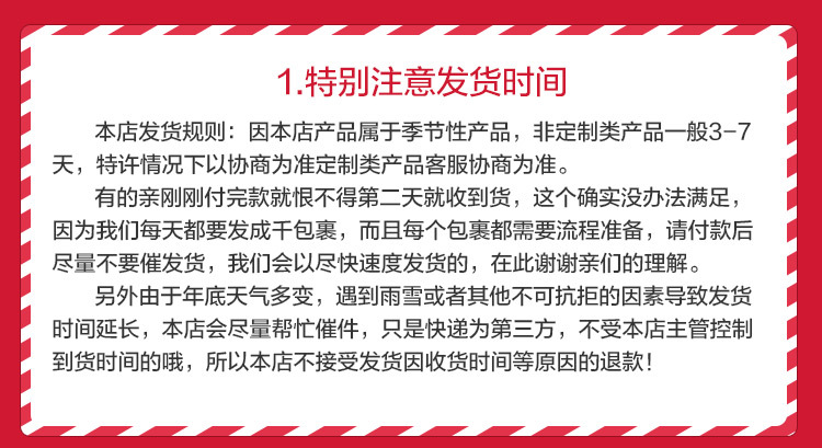 弊社が取り扱っている商品は、自社の海外工場から直送しています。ご入金が確認でき次第に商品を発送いたします。ご注文殺到時や、ご注文数量、種類が多い場合は、発送が遅れる可能性がございます、ご了承ください。ご注文商品の中に在庫がない商品につき、その商品のみキャンセルさせていただき、在庫のある商品のみをまとめて発送させていただきます。また、ご注文後の商品追加や、内容変更、同梱などはお受付しておりません。