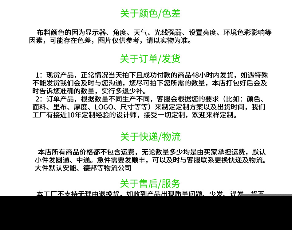 弊社が取り扱っている商品は、自社の海外工場から直送しています。ご入金が確認でき次第に商品を発送いたします。ご注文殺到時や、ご注文数量、種類が多い場合は、発送が遅れる可能性がございます、ご了承ください。ご注文商品の中に在庫がない商品につき、その商品のみキャンセルさせていただき、在庫のある商品のみをまとめて発送させていただきます。また、ご注文後の商品追加や、内容変更、同梱などはお受付しておりません。