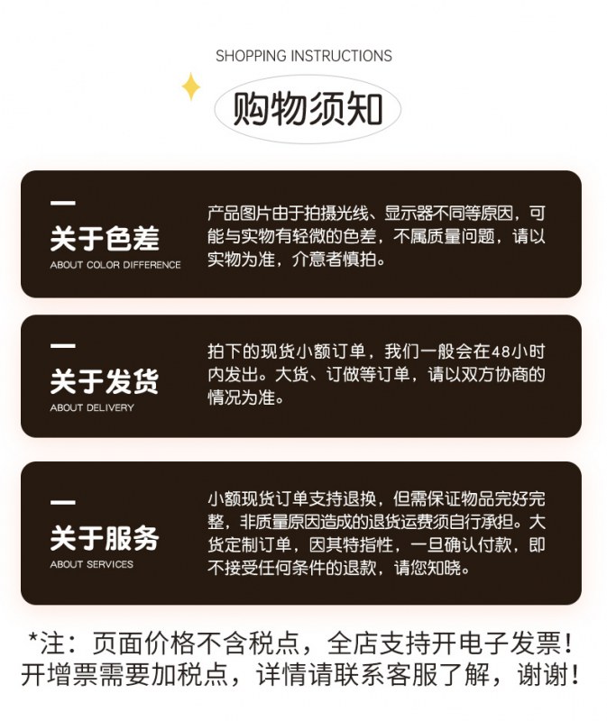 弊社が取り扱っている商品は、自社の海外工場から直送しています。ご入金が確認でき次第に商品を発送いたします。ご注文殺到時や、ご注文数量、種類が多い場合は、発送が遅れる可能性がございます、ご了承ください。ご注文商品の中に在庫がない商品につき、その商品のみキャンセルさせていただき、在庫のある商品のみをまとめて発送させていただきます。また、ご注文後の商品追加や、内容変更、同梱などはお受付しておりません。