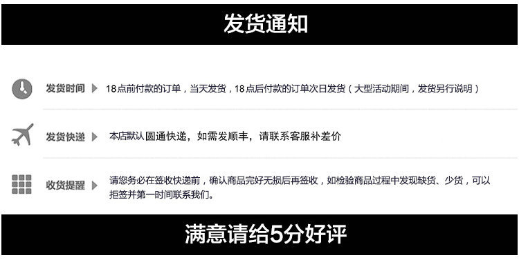 弊社が取り扱っている商品は、自社の海外工場から直送しています。ご入金が確認でき次第に商品を発送いたします。ご注文殺到時や、ご注文数量、種類が多い場合は、発送が遅れる可能性がございます、ご了承ください。ご注文商品の中に在庫がない商品につき、その商品のみキャンセルさせていただき、在庫のある商品のみをまとめて発送させていただきます。また、ご注文後の商品追加や、内容変更、同梱などはお受付しておりません。