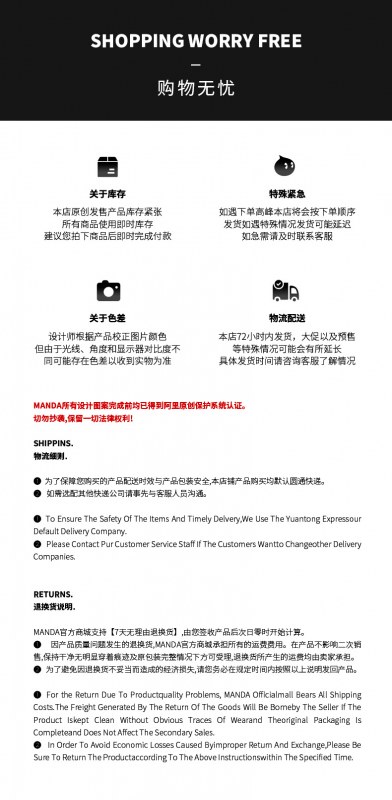 弊社が取り扱っている商品は、自社の海外工場から直送しています。ご入金が確認でき次第に商品を発送いたします。ご注文殺到時や、ご注文数量、種類が多い場合は、発送が遅れる可能性がございます、ご了承ください。ご注文商品の中に在庫がない商品につき、その商品のみキャンセルさせていただき、在庫のある商品のみをまとめて発送させていただきます。また、ご注文後の商品追加や、内容変更、同梱などはお受付しておりません。