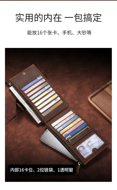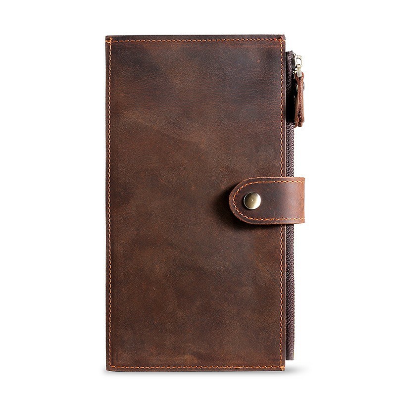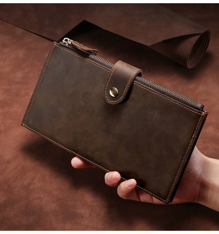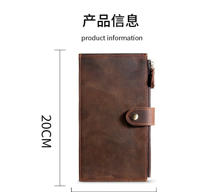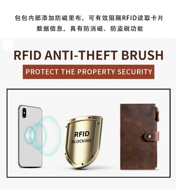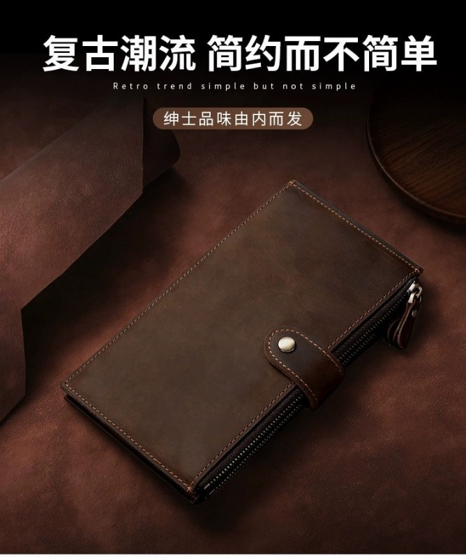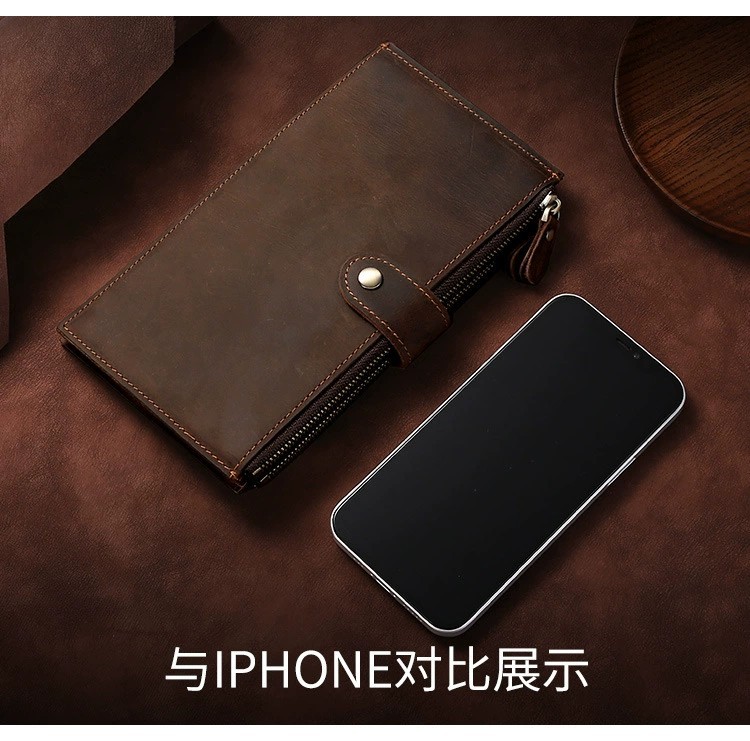 • 複数のカードスロットを備えた本革メンズ長財布、RFID消磁防止、携帯電話を収納できる盗難防止ブラシジッパーウォレット