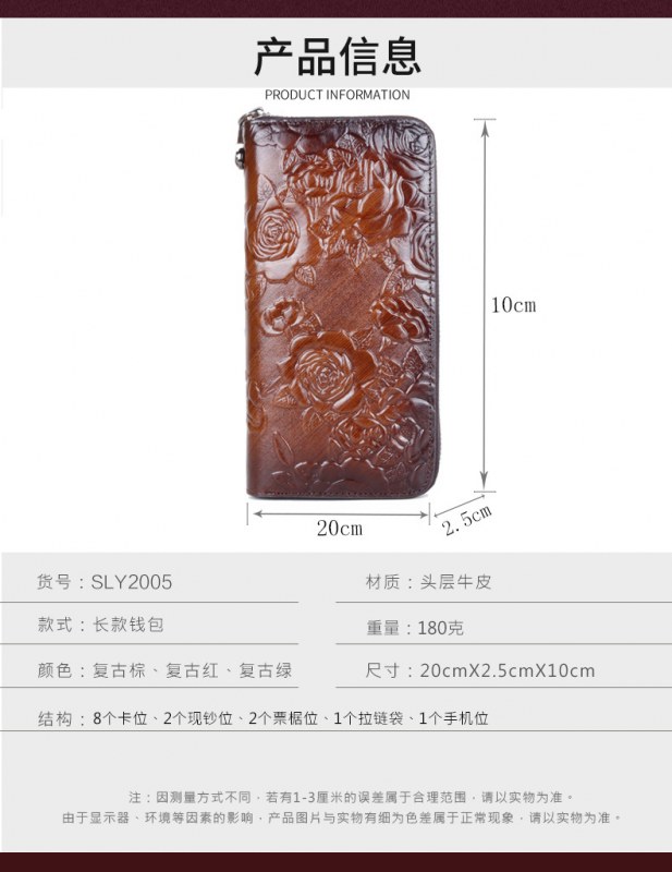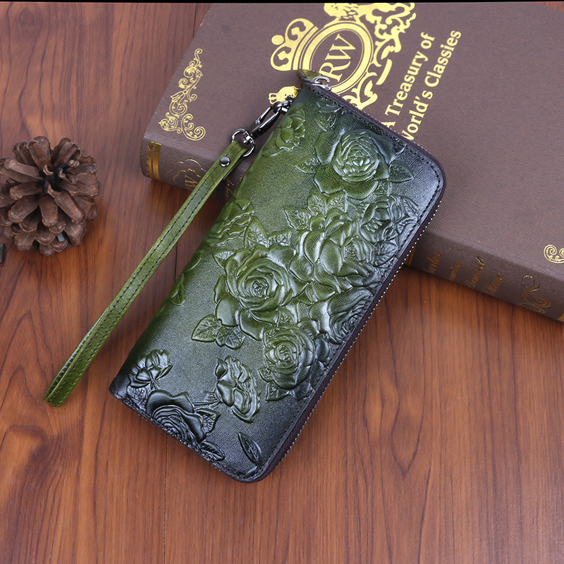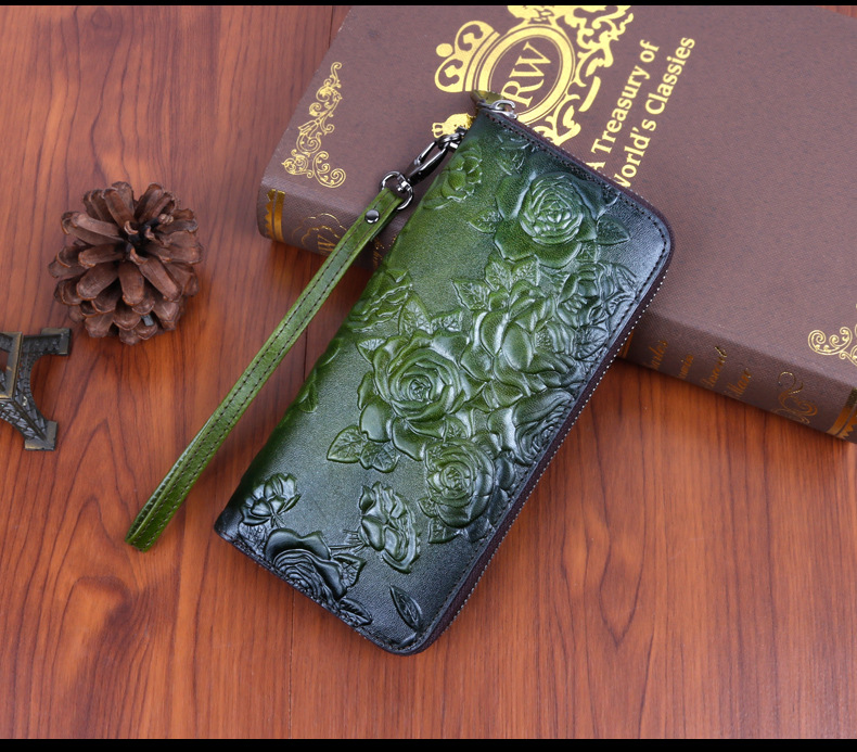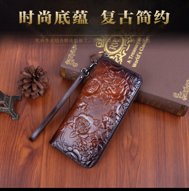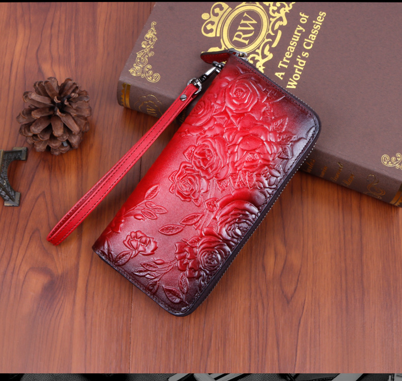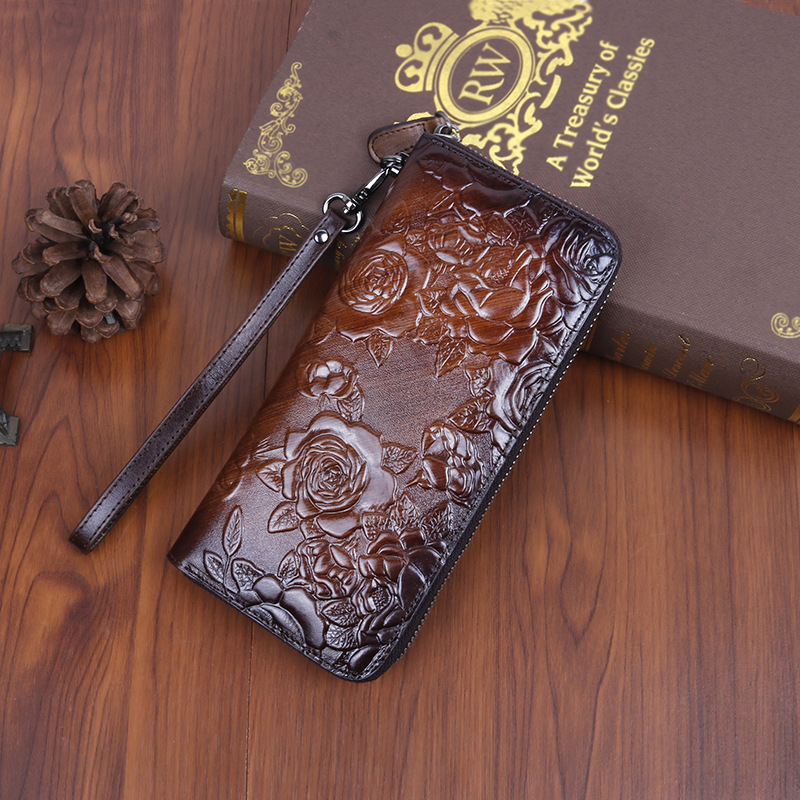 • 新しいスタイルの牛革、レトロなスタイルのロングレディースクラッチ、ファッショナブルなマルチカードスロットエンボス加工とカラージッパーバッグ