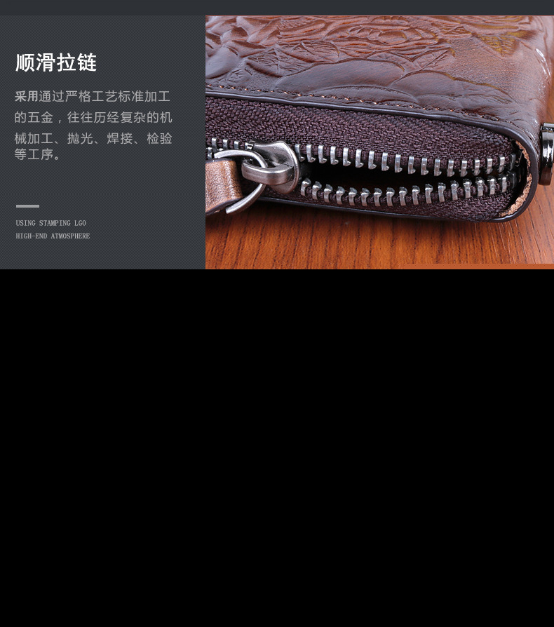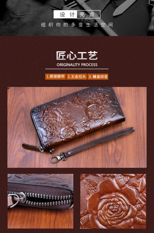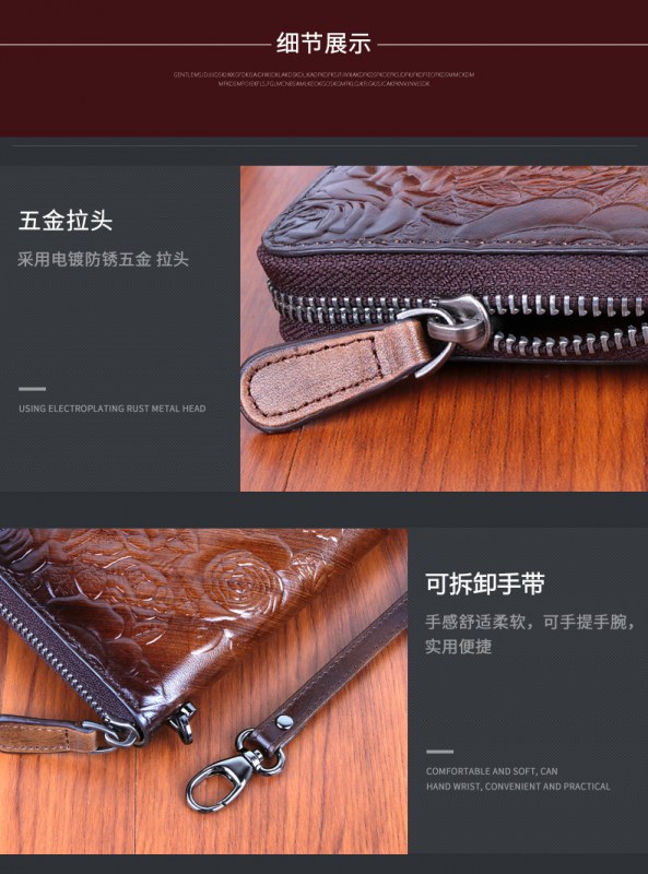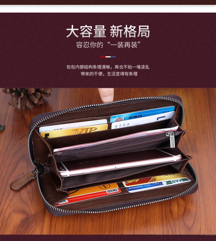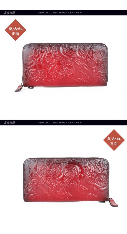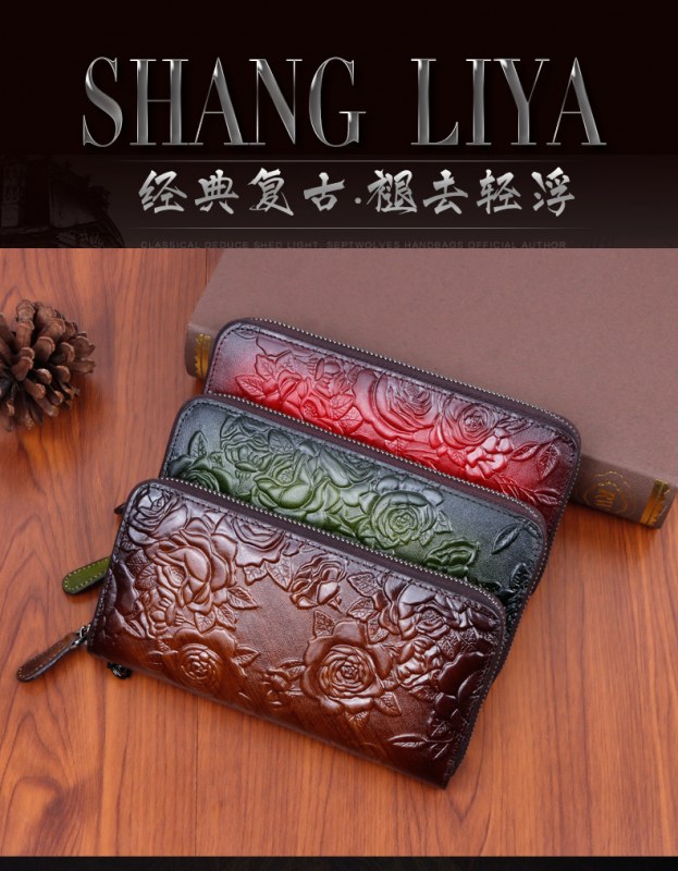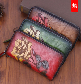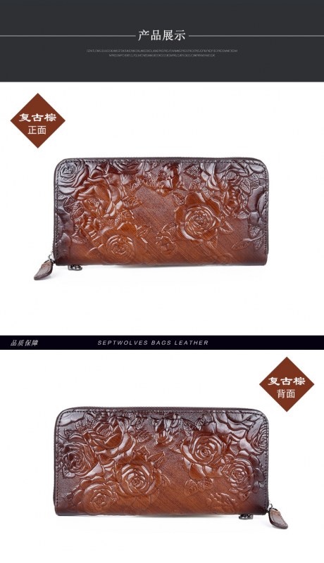 • 新しいスタイルの牛革、レトロなスタイルのロングレディースクラッチ、ファッショナブルなマルチカードスロットエンボス加工とカラージッパーバッグ