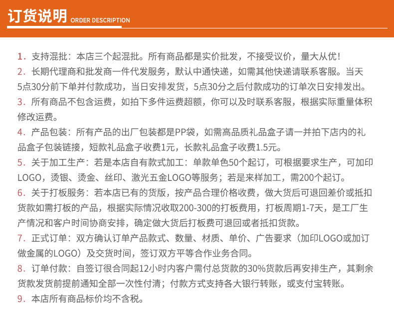 弊社が取り扱っている商品は、自社の海外工場から直送しています。ご入金が確認でき次第に商品を発送いたします。ご注文殺到時や、ご注文数量、種類が多い場合は、発送が遅れる可能性がございます、ご了承ください。ご注文商品の中に在庫がない商品につき、その商品のみキャンセルさせていただき、在庫のある商品のみをまとめて発送させていただきます。また、ご注文後の商品追加や、内容変更、同梱などはお受付しておりません。