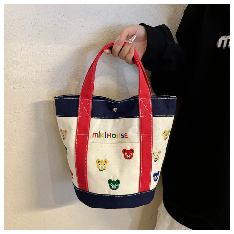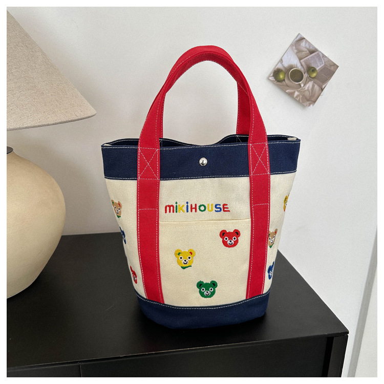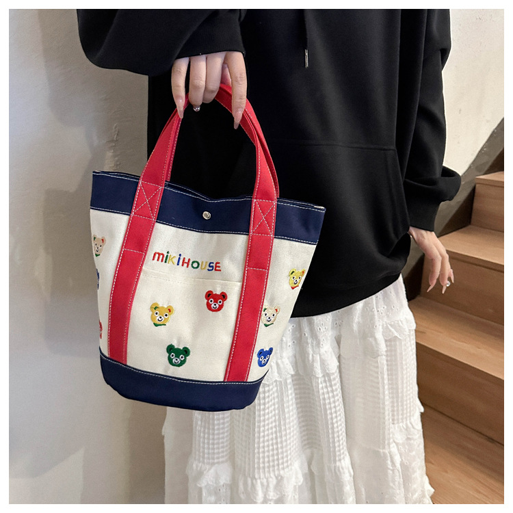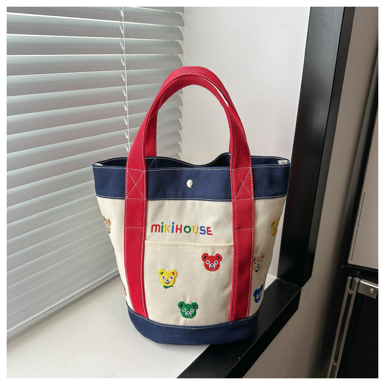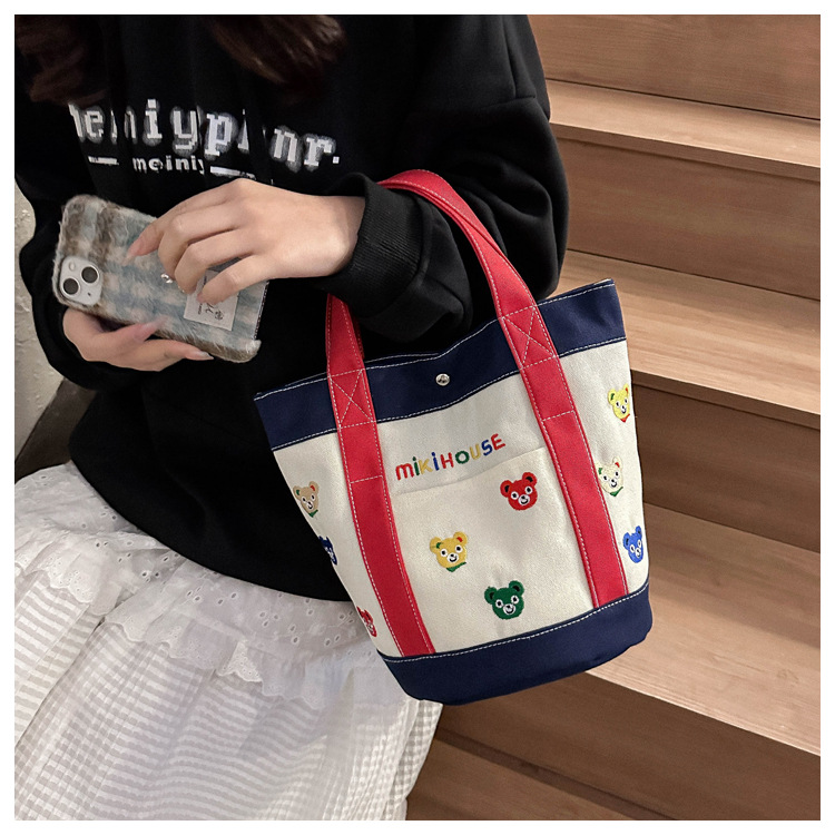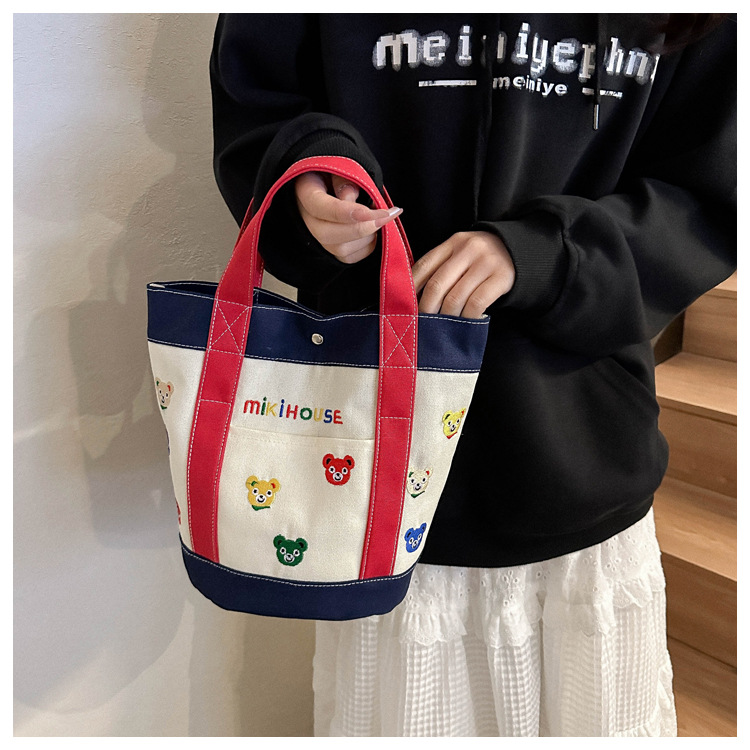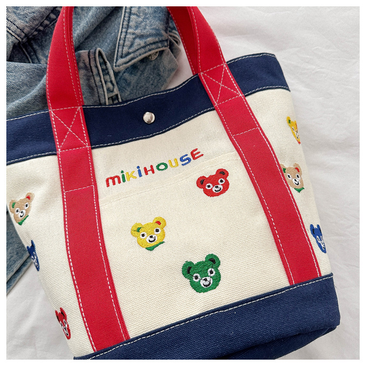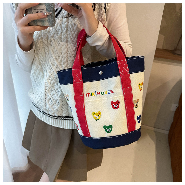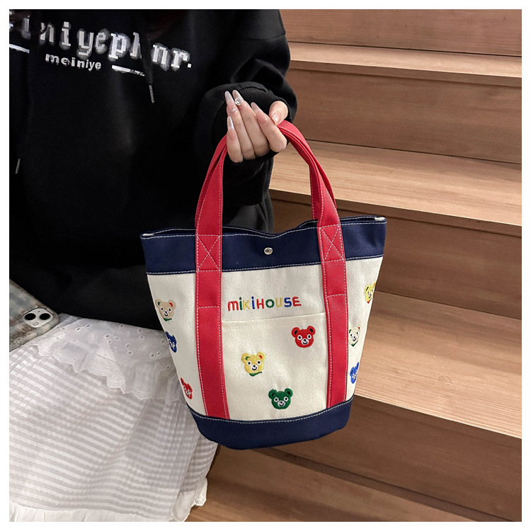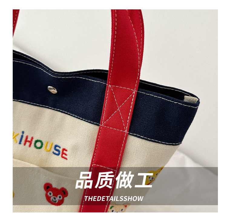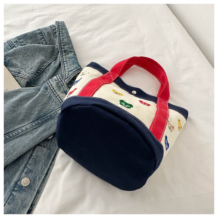 • カジュアルシンプルなキャンバスバッグ新しいレディースバッグ漫画刺繍動物レターバッグ和風カラーマッチングハンドバッグランチバッグ