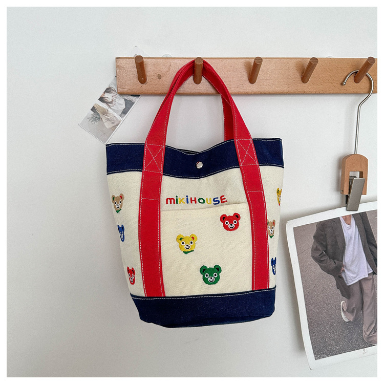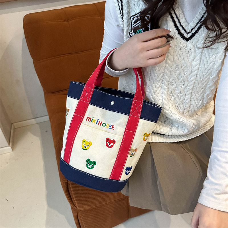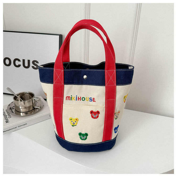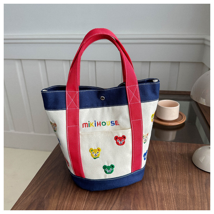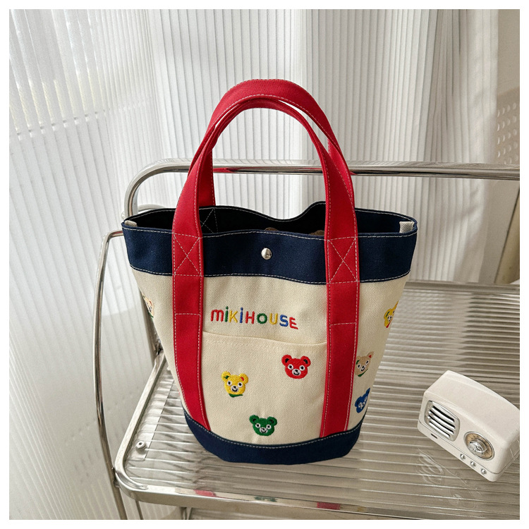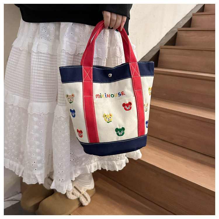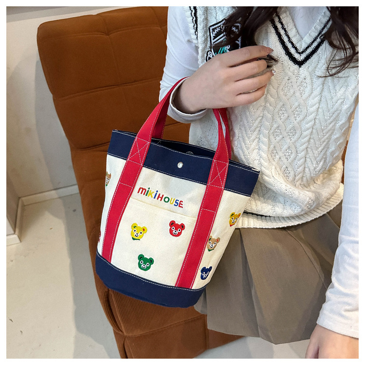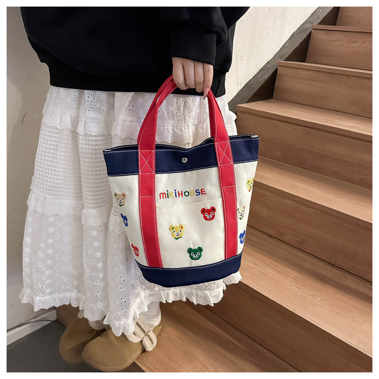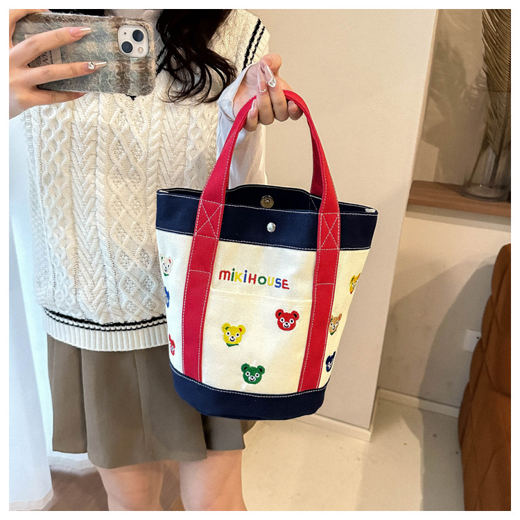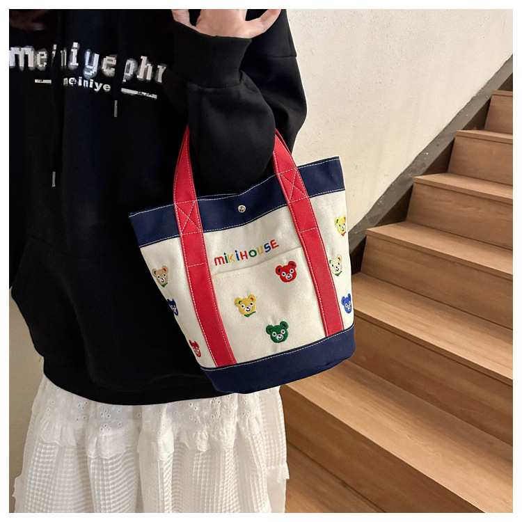 • カジュアルシンプルなキャンバスバッグ新しいレディースバッグ漫画刺繍動物レターバッグ和風カラーマッチングハンドバッグランチバッグ