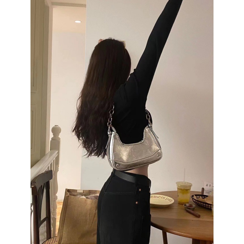 • シルバーレディースバッグ 2024 新しいニッチポータブルチェーンバゲット脇の下バッグデザイン多目的ショルダークロスボディバッグ