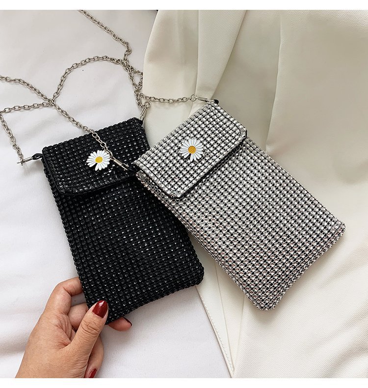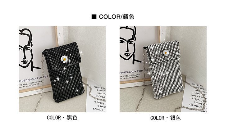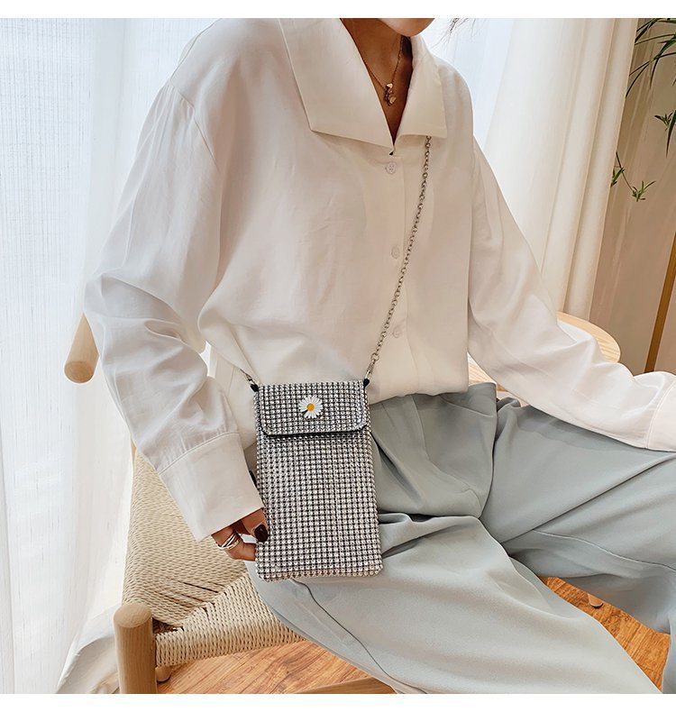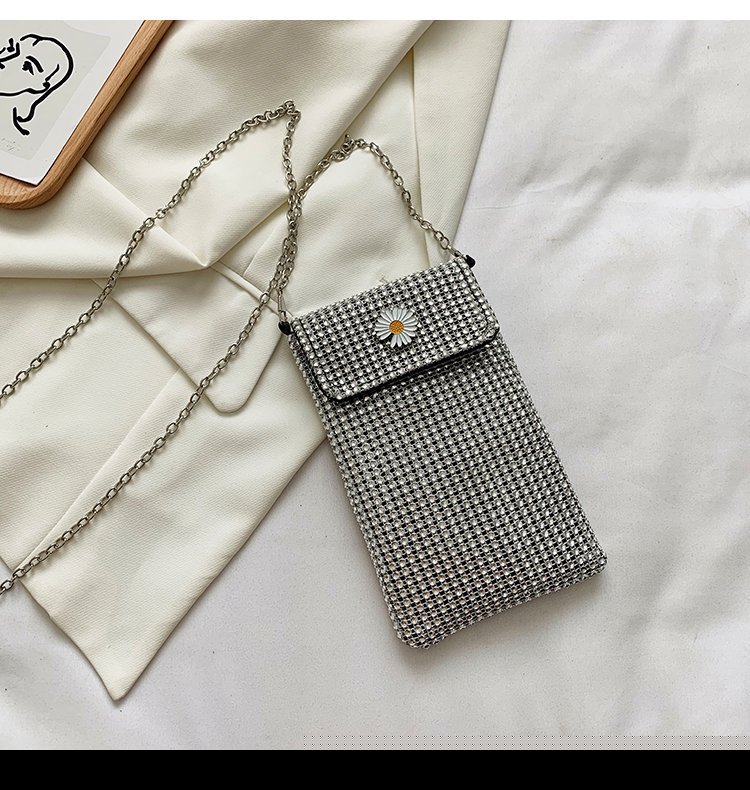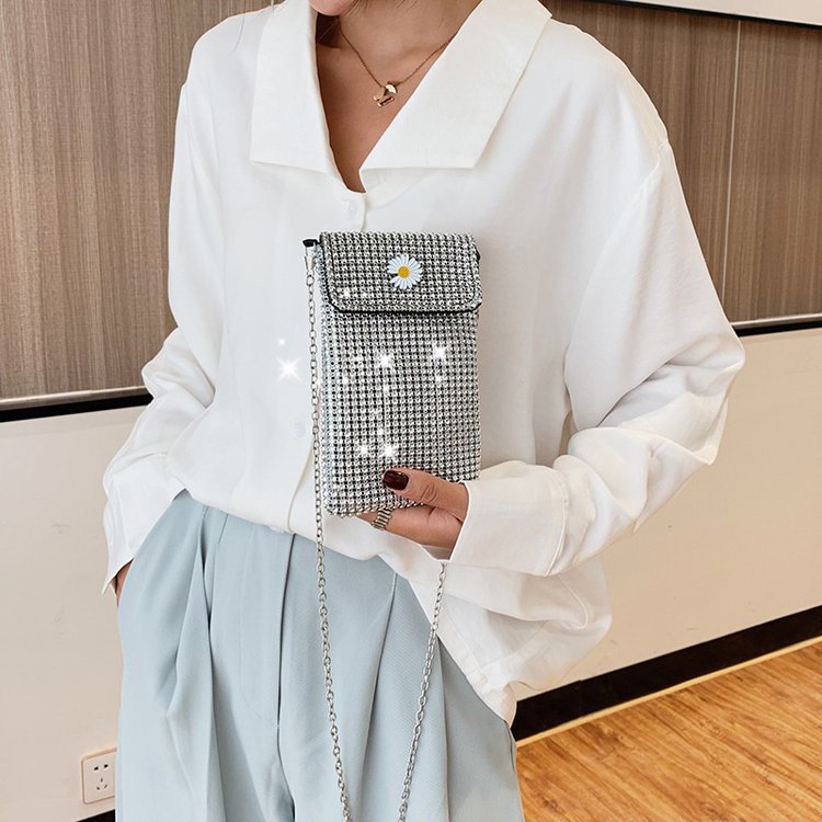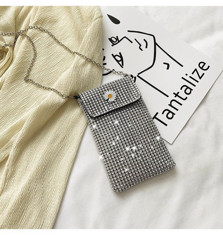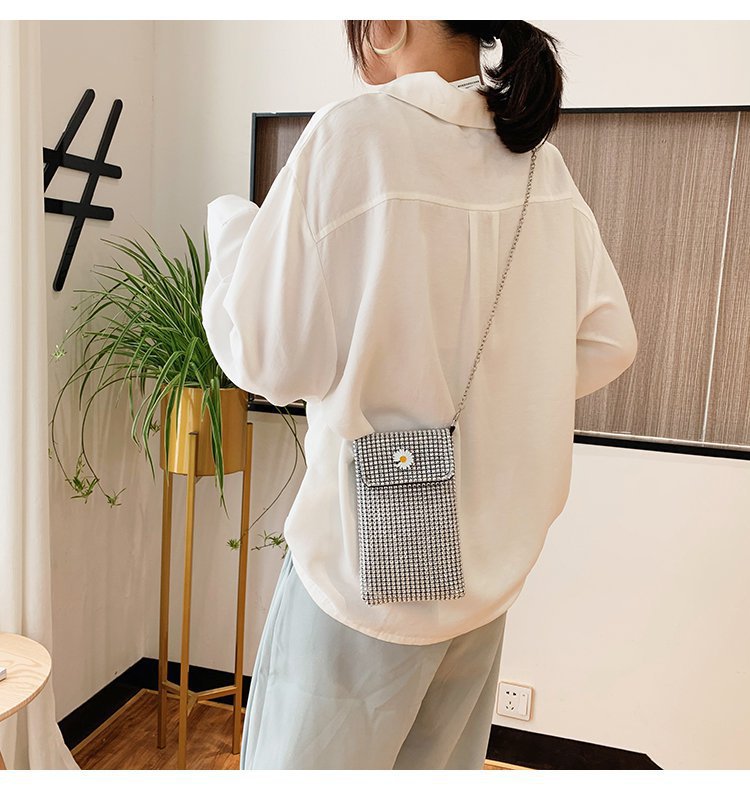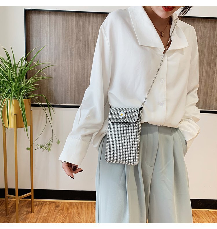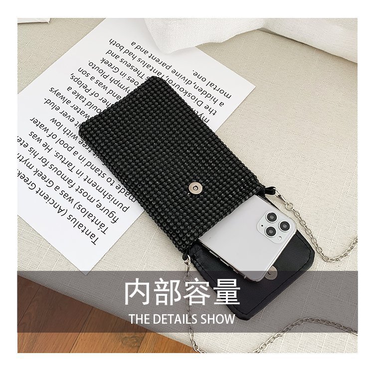 • ダイヤモンドと輝くチェーンショルダークロスボディバッグがいっぱいのカジュアルストリート、トレンディでファッショナブルで光沢のあるパーソナライズされた携帯電話バッグ