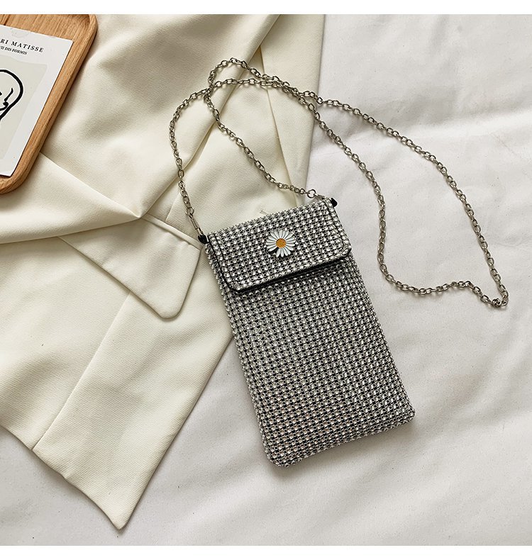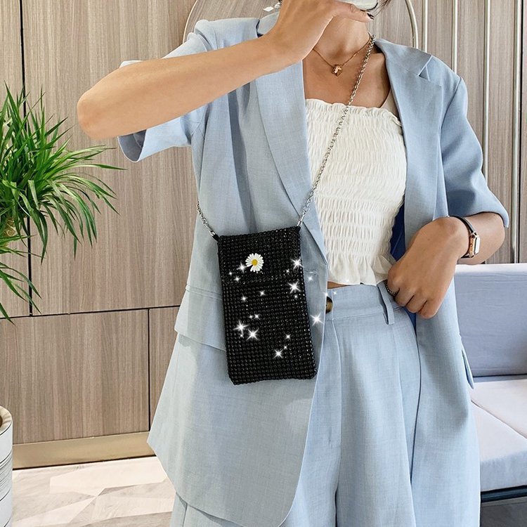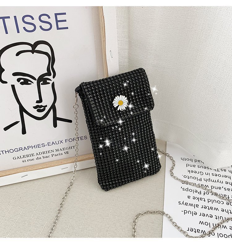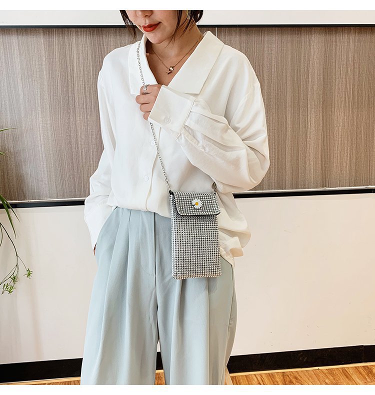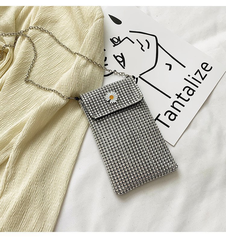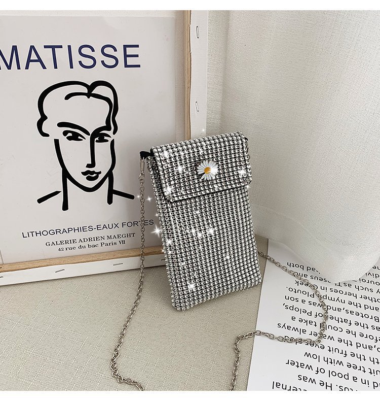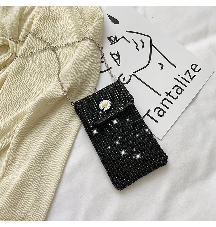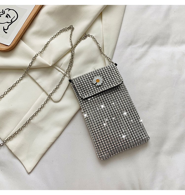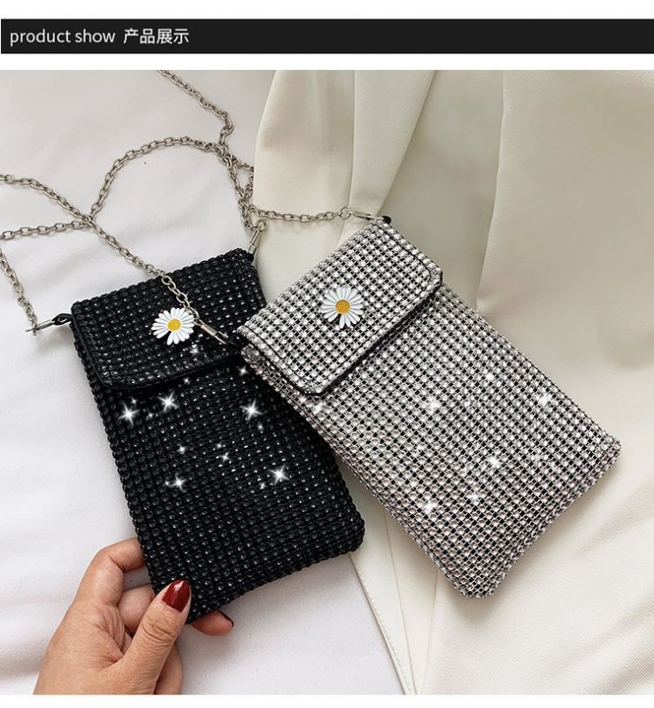 • ダイヤモンドと輝くチェーンショルダークロスボディバッグがいっぱいのカジュアルストリート、トレンディでファッショナブルで光沢のあるパーソナライズされた携帯電話バッグ