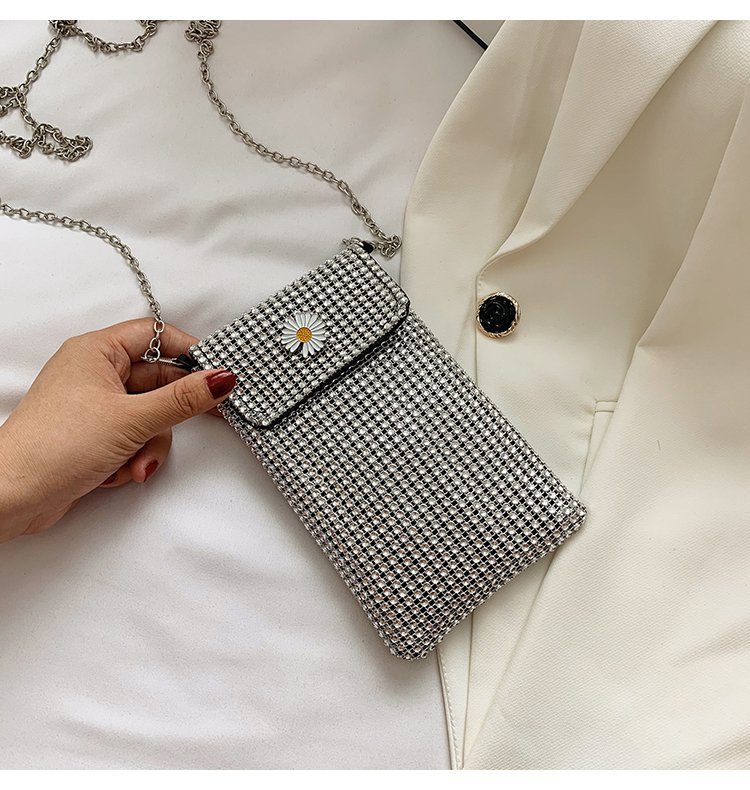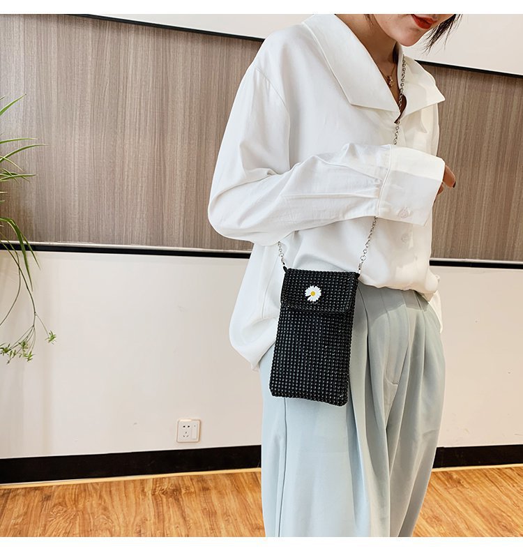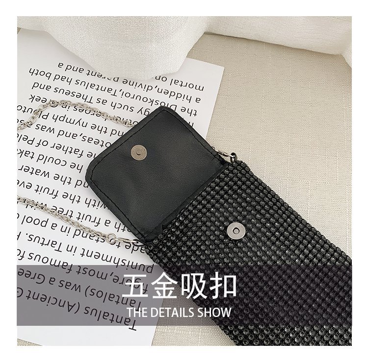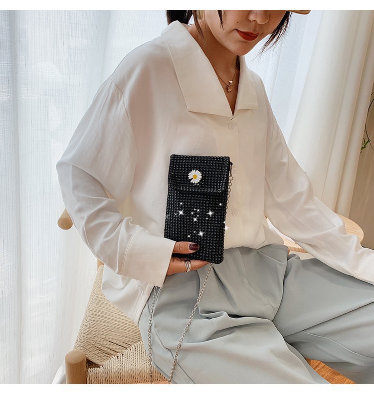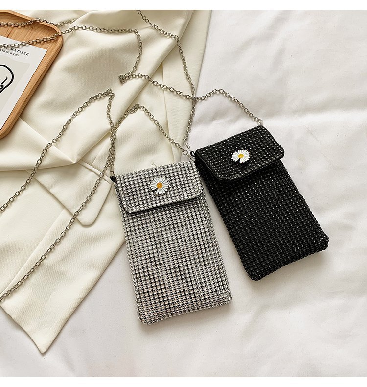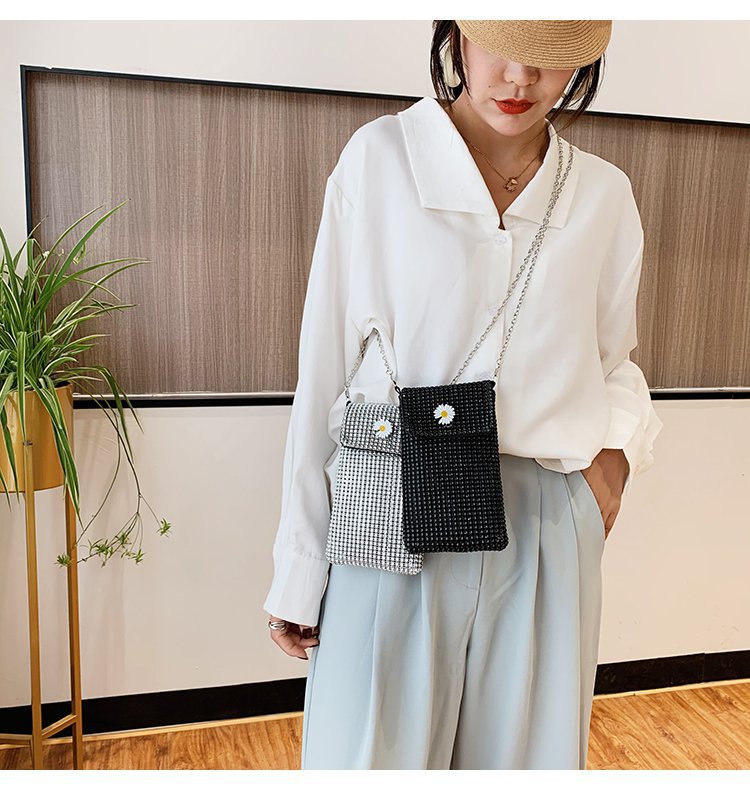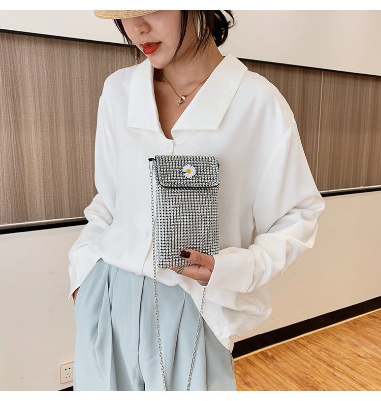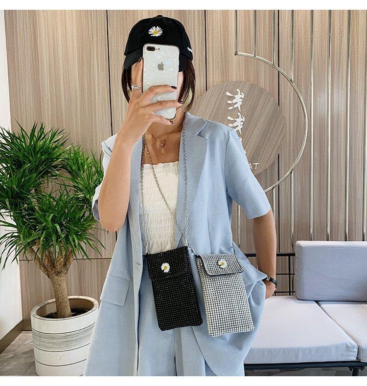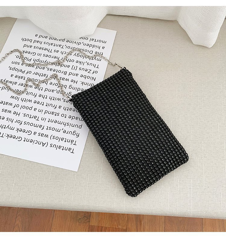 • ダイヤモンドと輝くチェーンショルダークロスボディバッグがいっぱいのカジュアルストリート、トレンディでファッショナブルで光沢のあるパーソナライズされた携帯電話バッグ