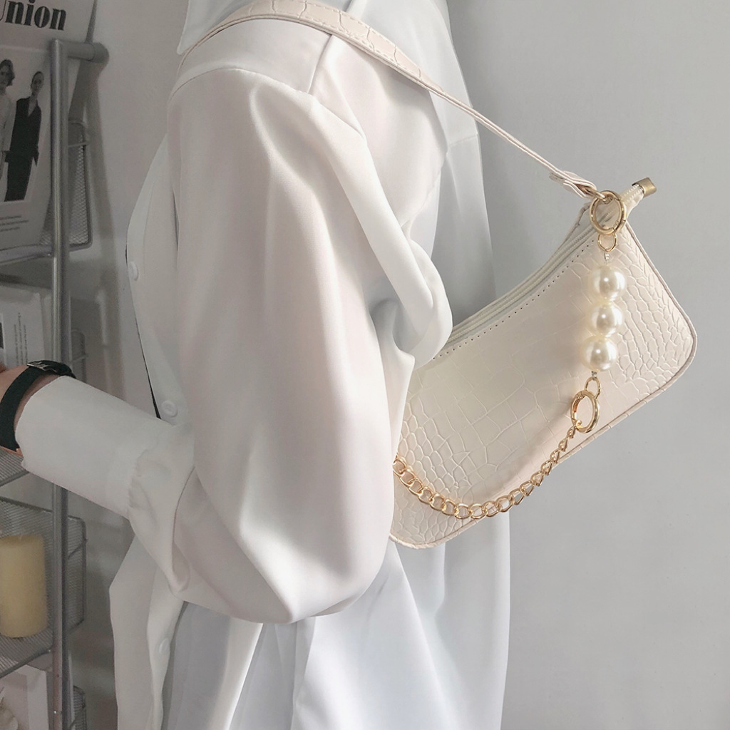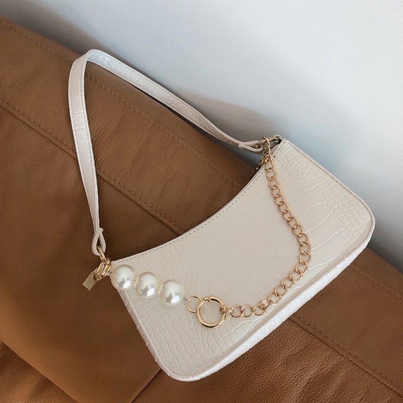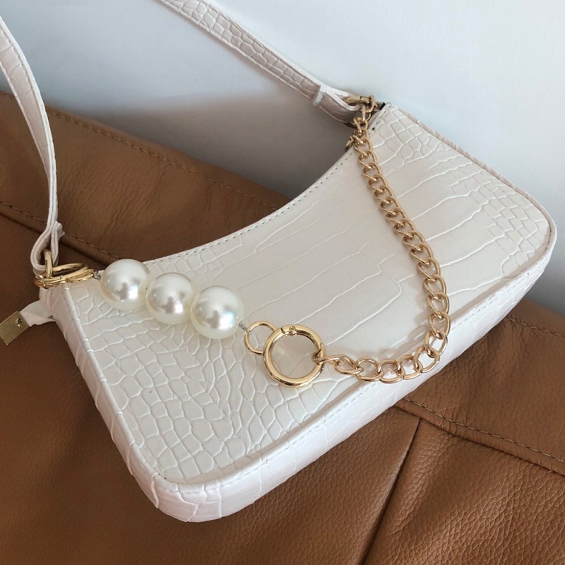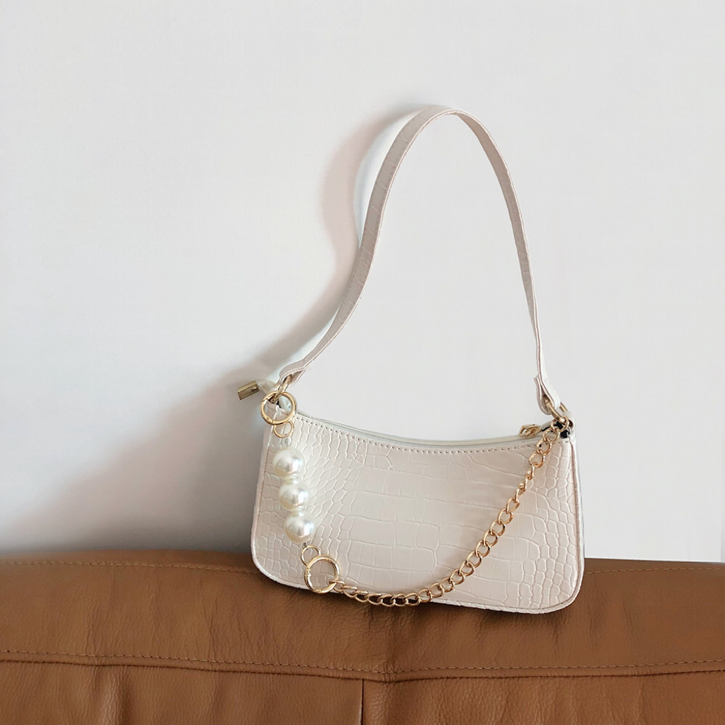 • 2024新しいテクスチャードワンショルダークロスボディ脇の下バッグインシンプルで控えめなクロコダイルパターンゴールドチェーンパールバッグ
