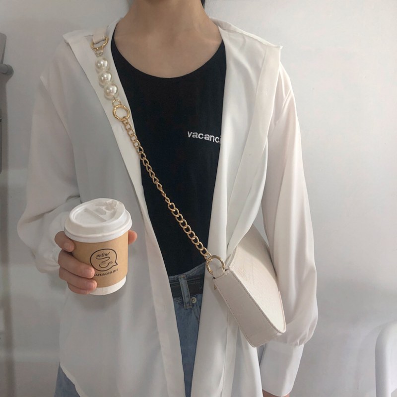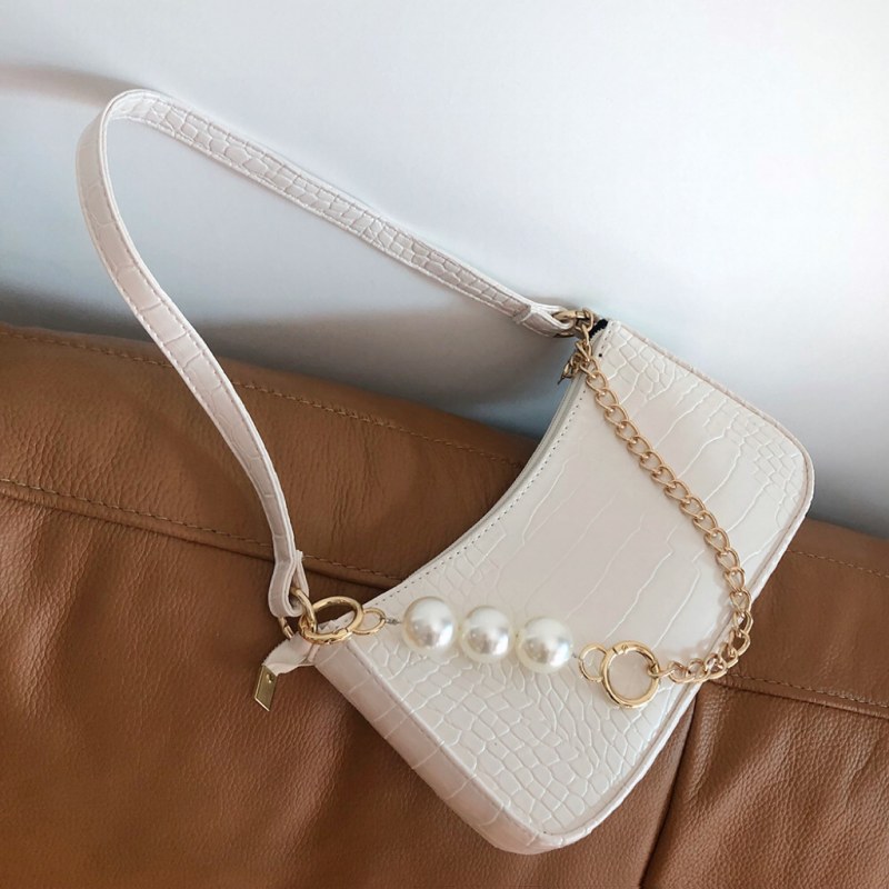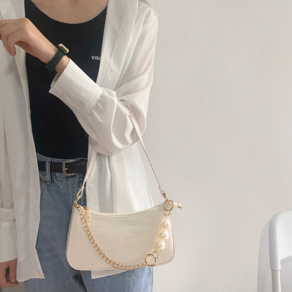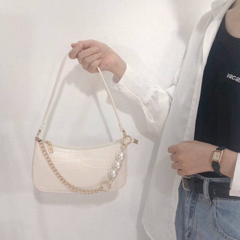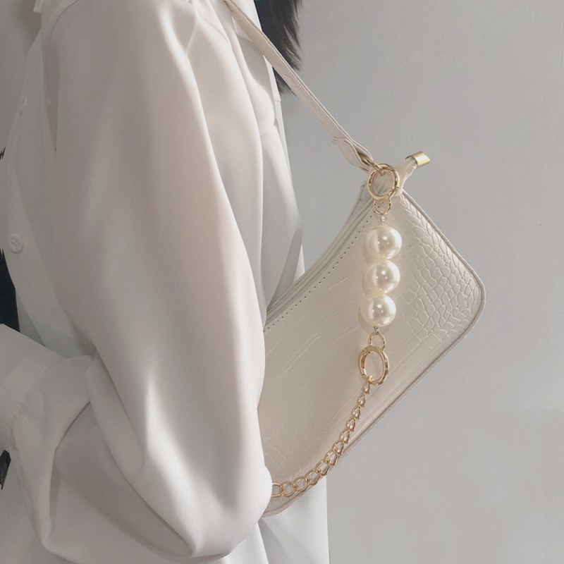 • 2024新しいテクスチャードワンショルダークロスボディ脇の下バッグインシンプルで控えめなクロコダイルパターンゴールドチェーンパールバッグ