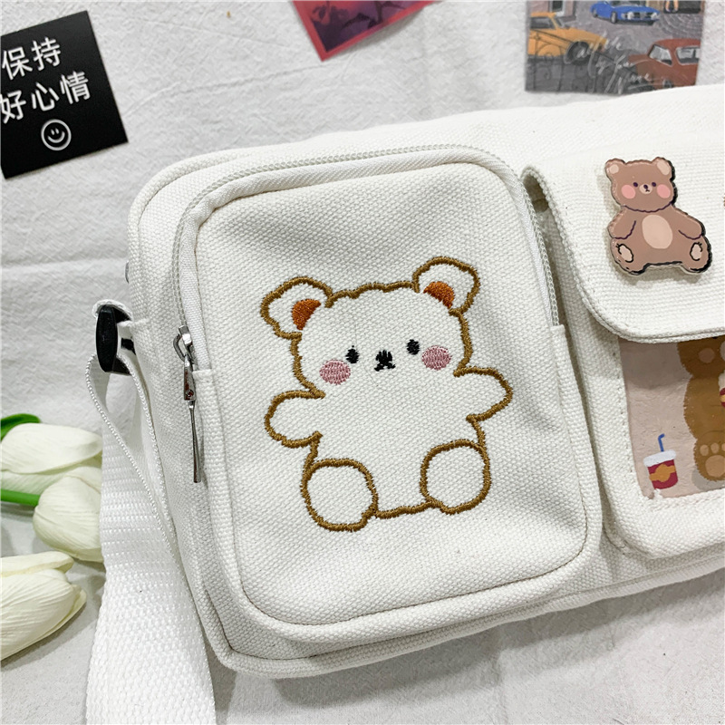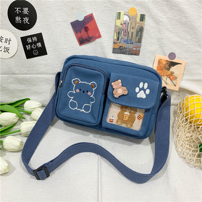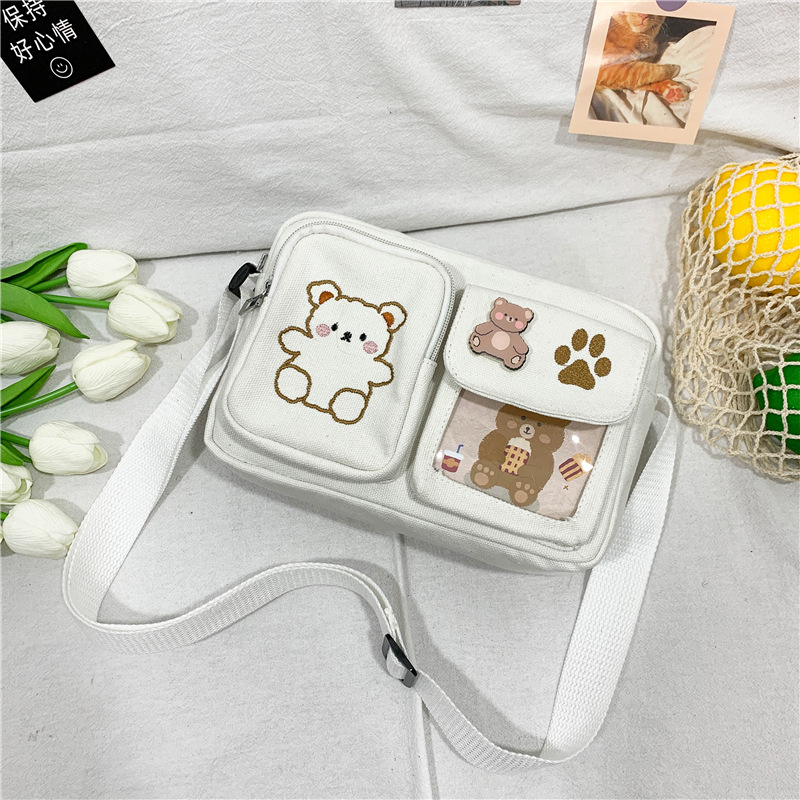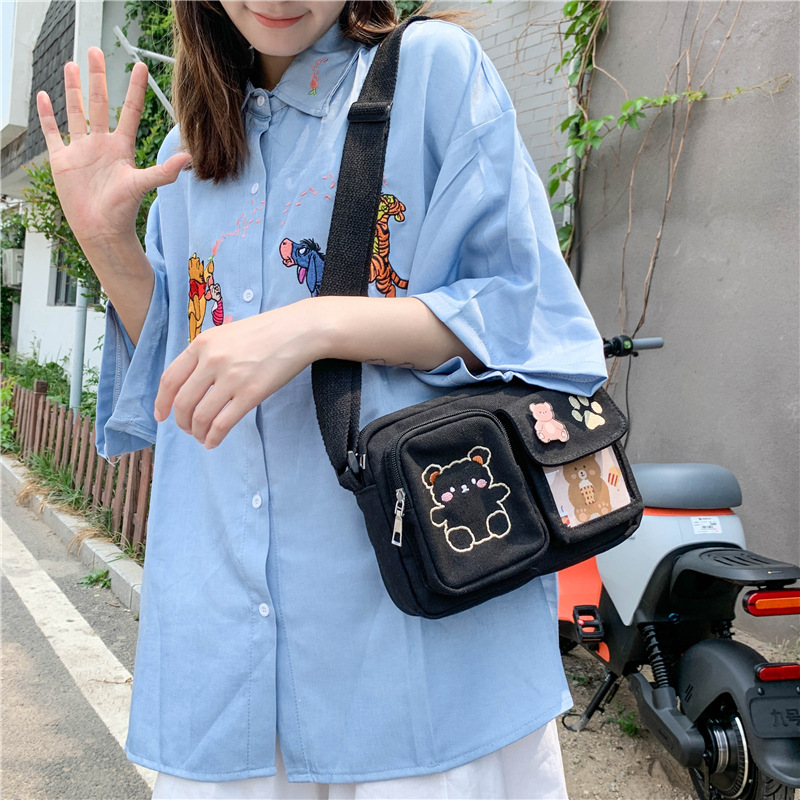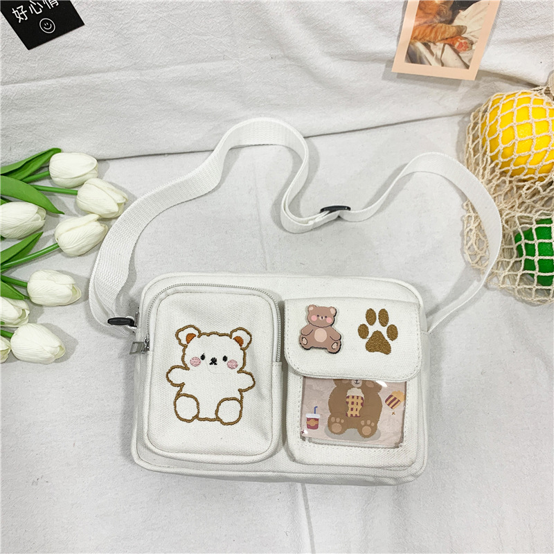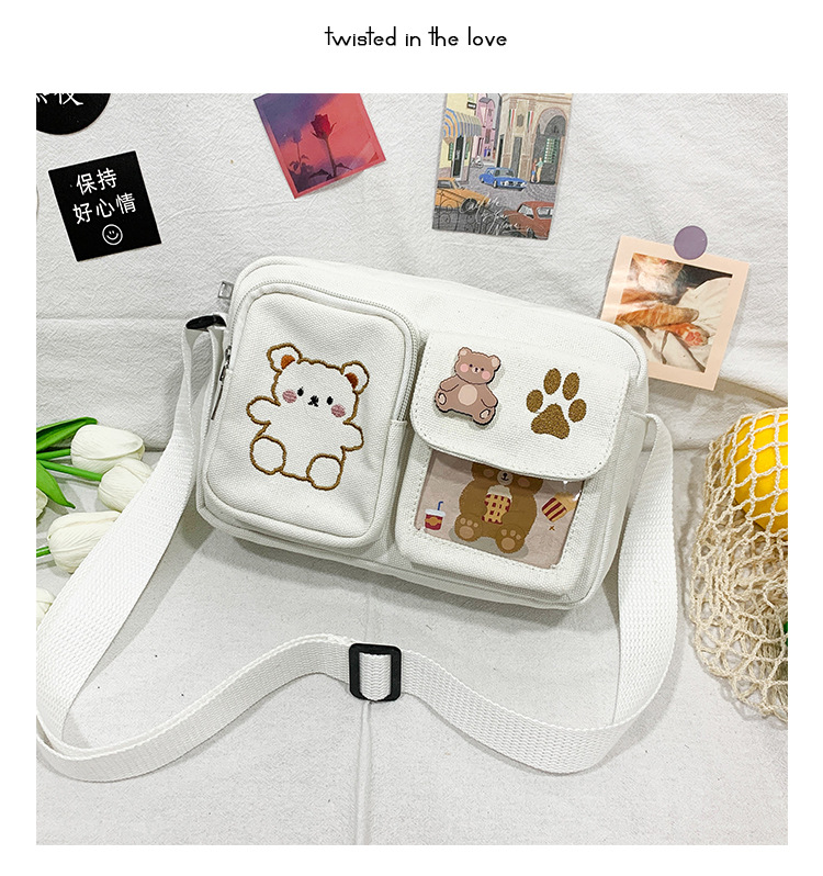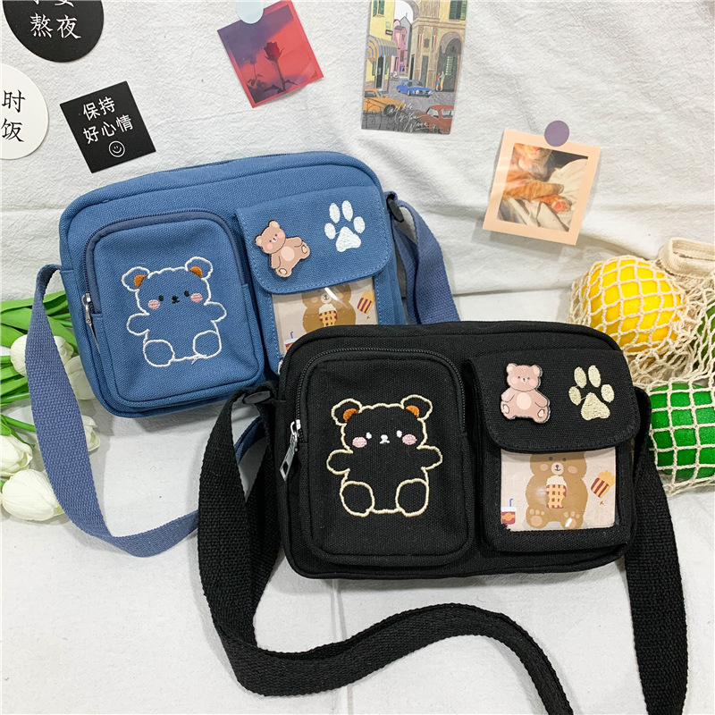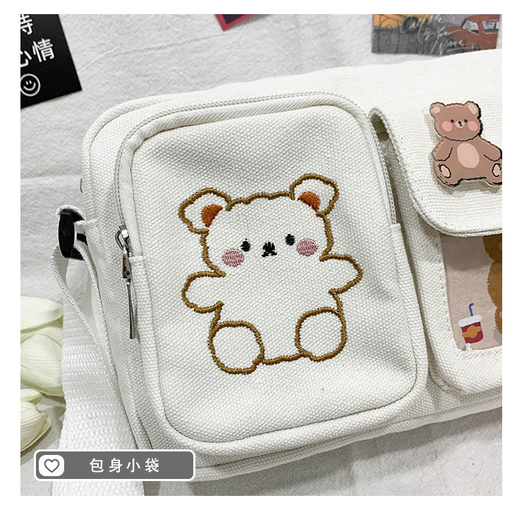 • キャンバススモールバッグ和風インヴィンテージセンスかわいいと面白い個性刺繍クマ学生透明クロスボディバッグ