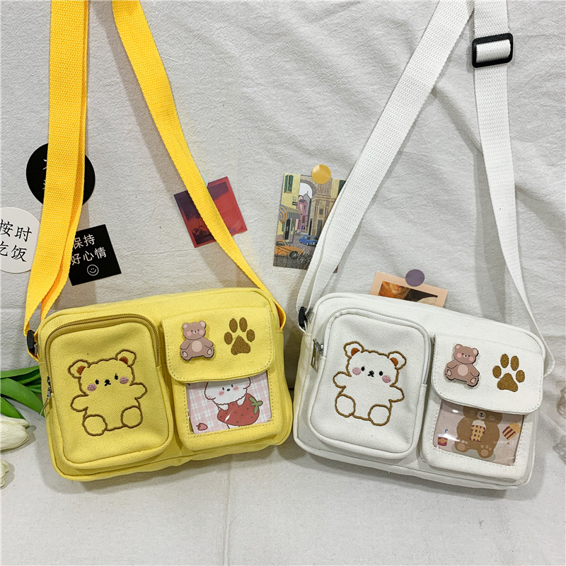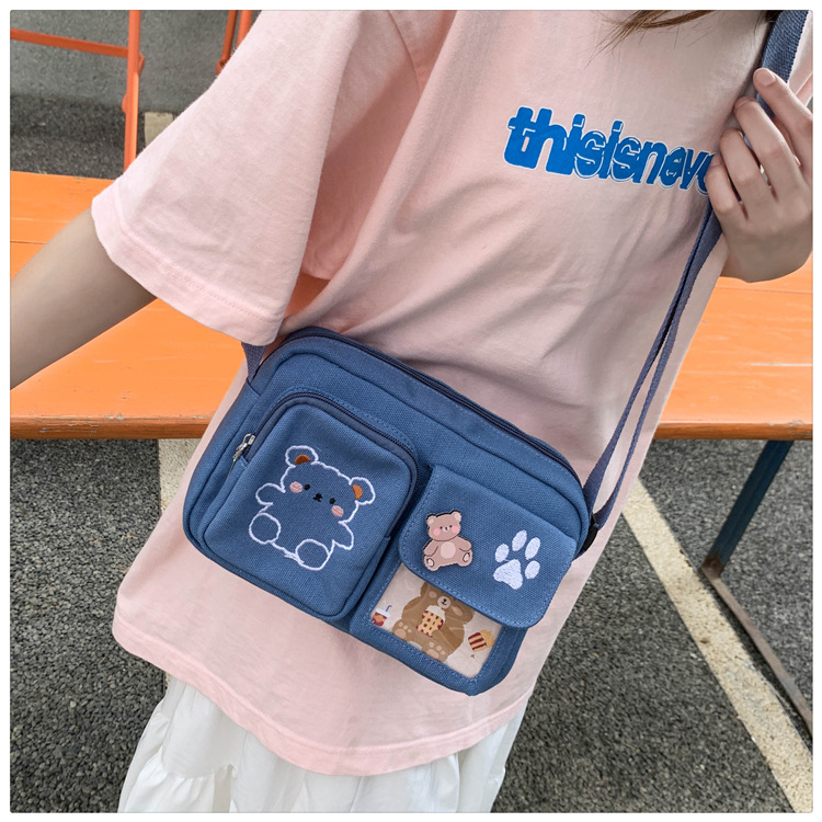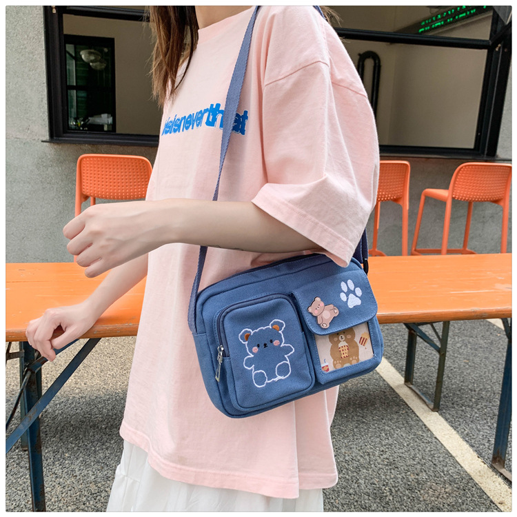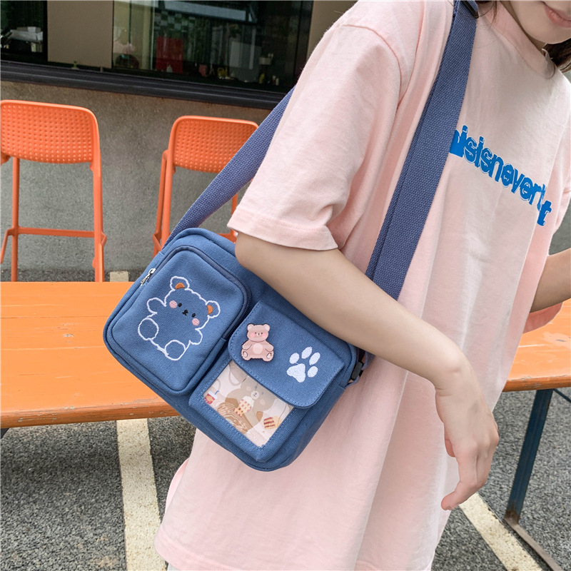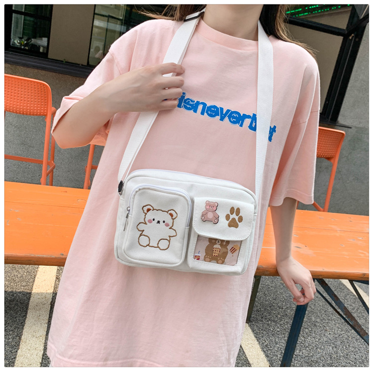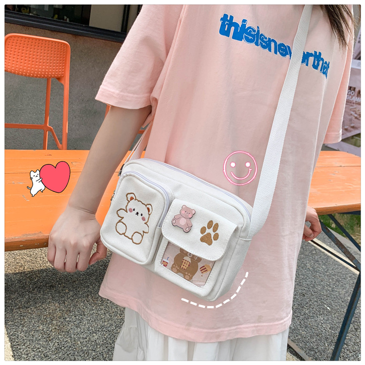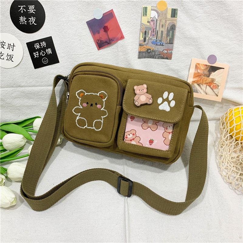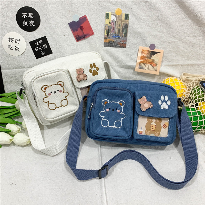 • キャンバススモールバッグ和風インヴィンテージセンスかわいいと面白い個性刺繍クマ学生透明クロスボディバッグ