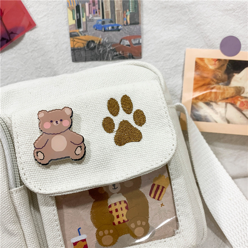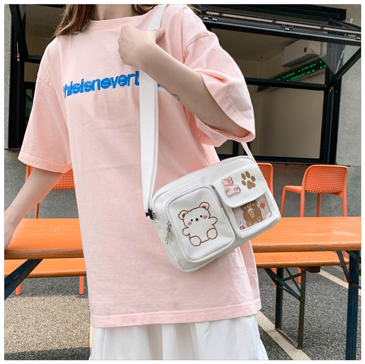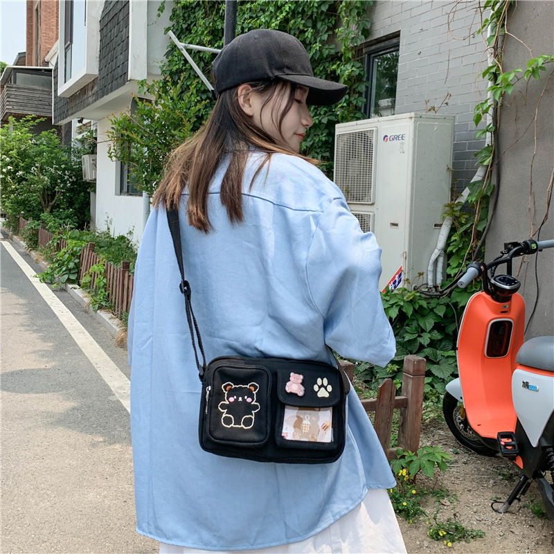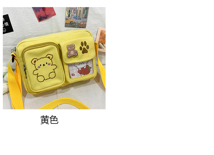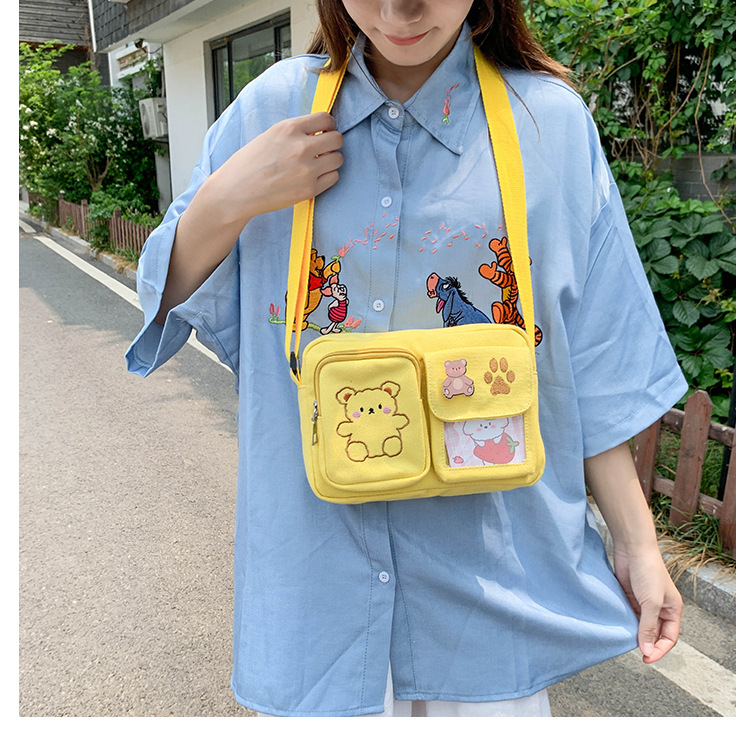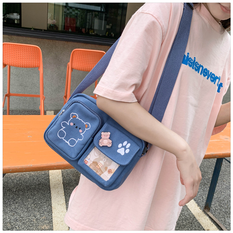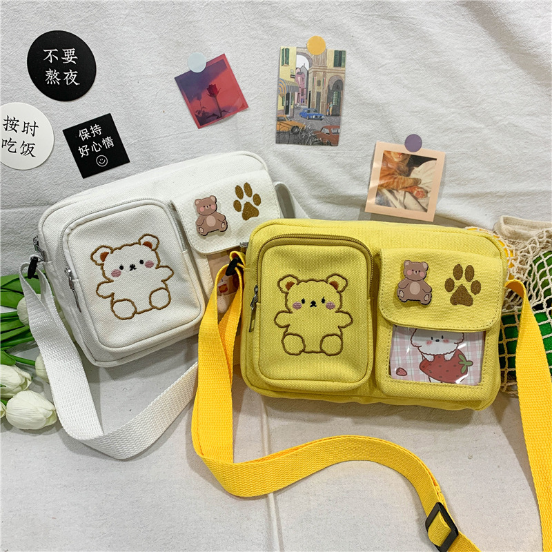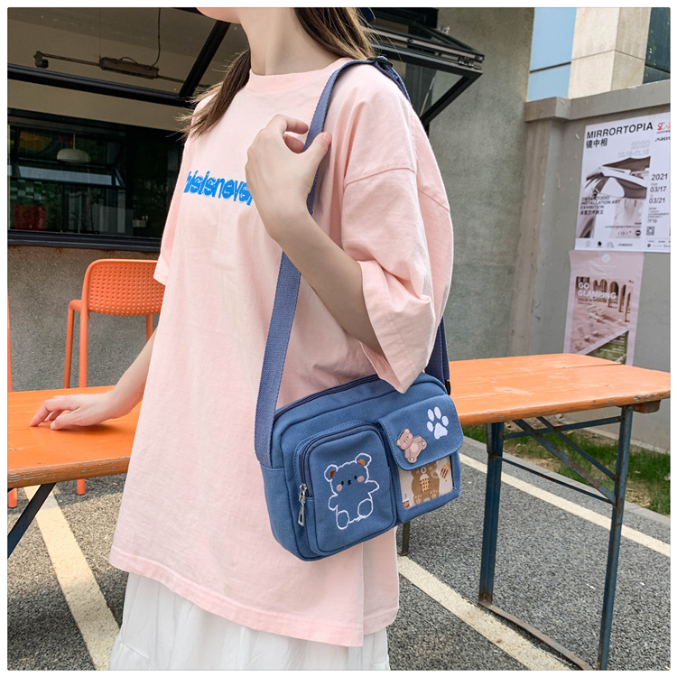 • キャンバススモールバッグ和風インヴィンテージセンスかわいいと面白い個性刺繍クマ学生透明クロスボディバッグ
