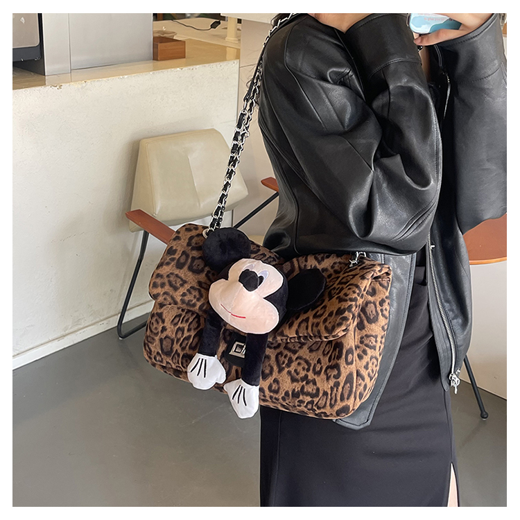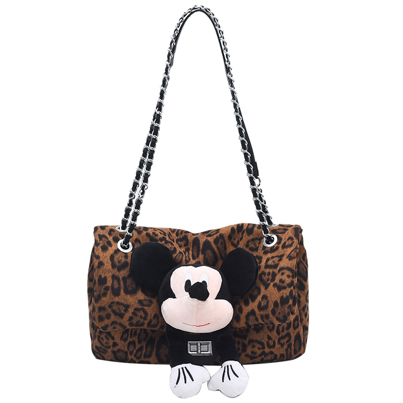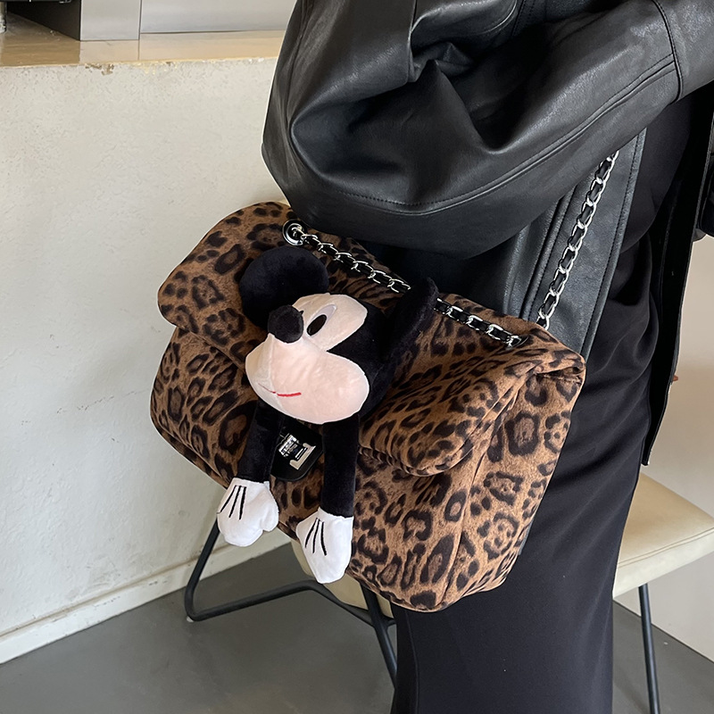 • カジュアル通勤大容量ヒョウ柄バッグ女性のための 2024 新しいワンショルダークロスボディミッキー人形バッグ秋冬トートバッグ