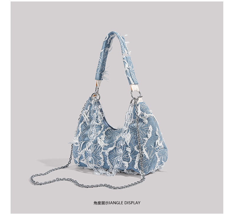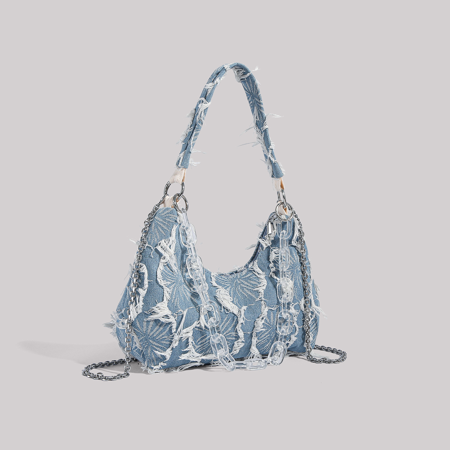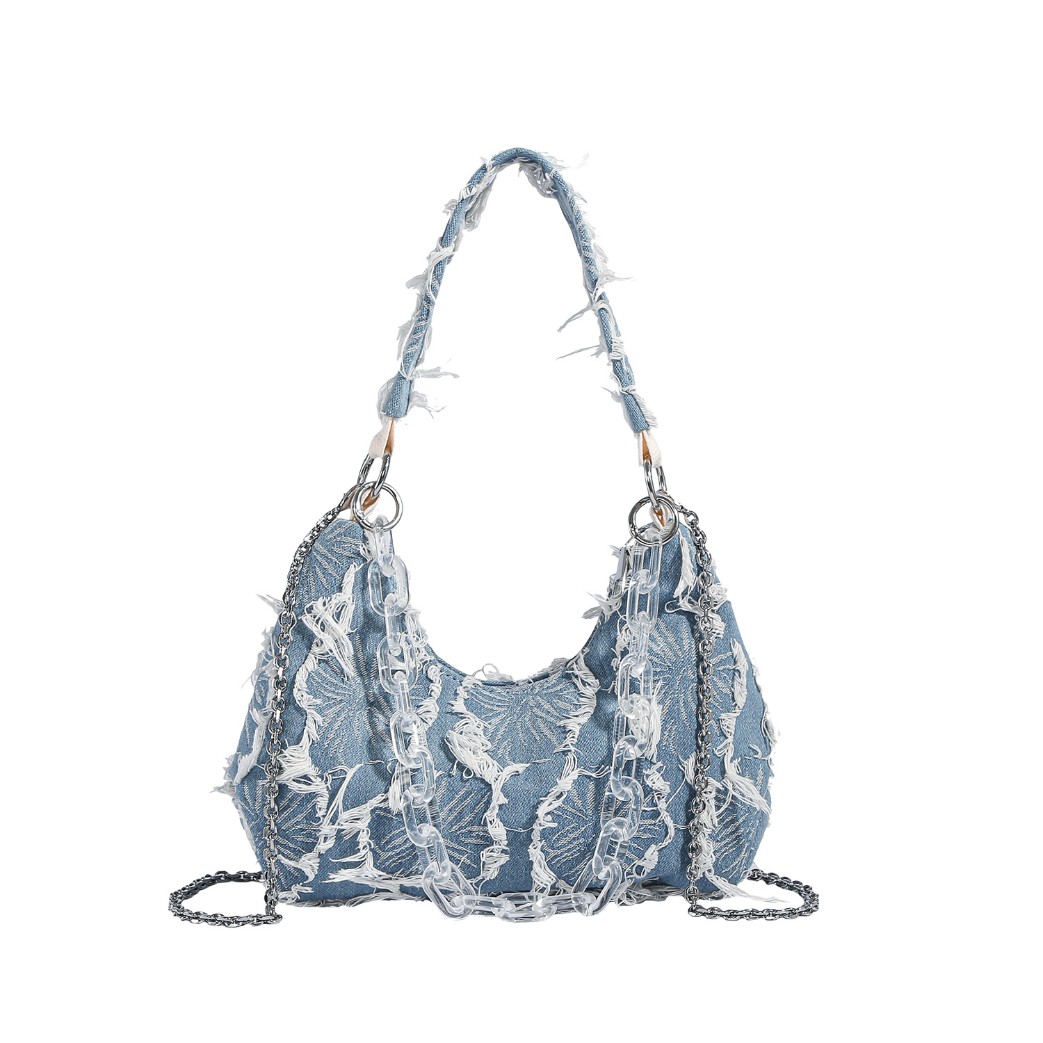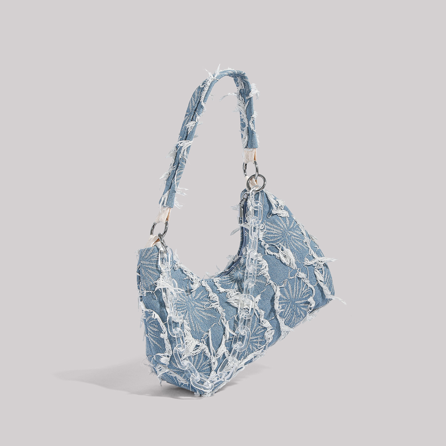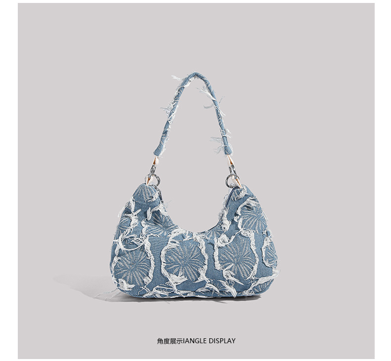 • 女性のための夏のデニムバッグ 2024 新しいスタイルのハイエンドファッション多用途甘くてクールな通勤脇の下バゲットショルダーバッグ