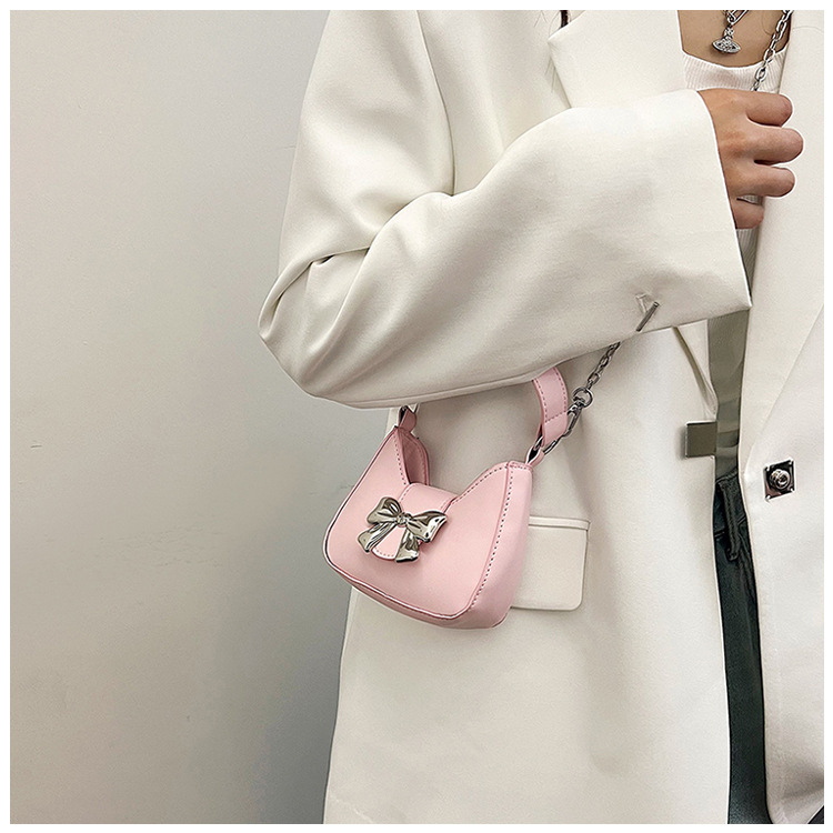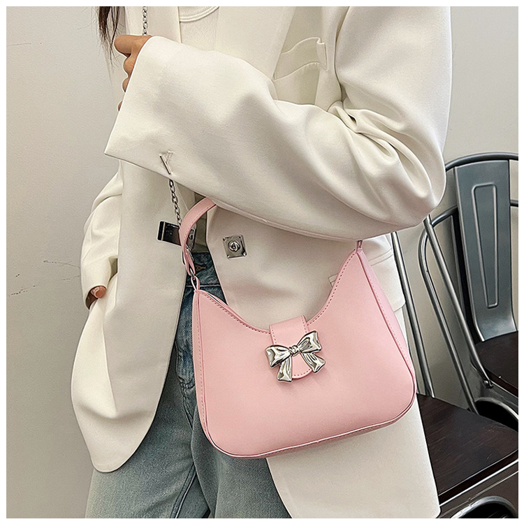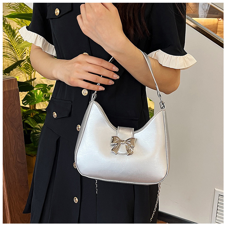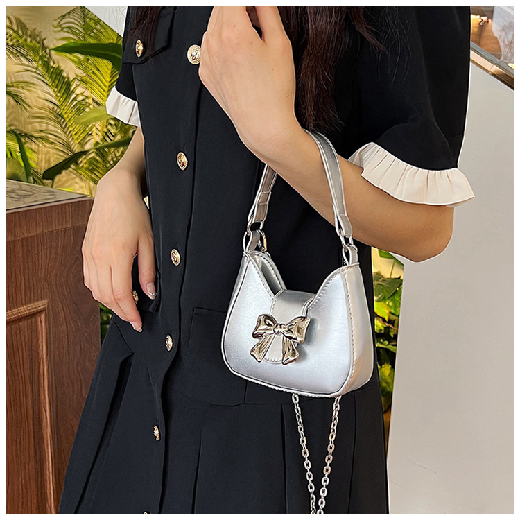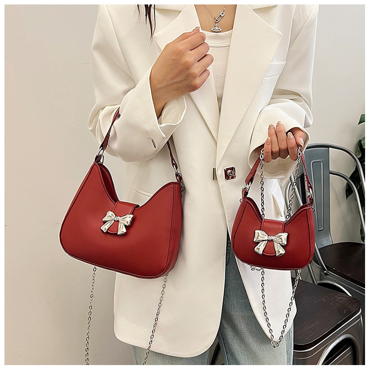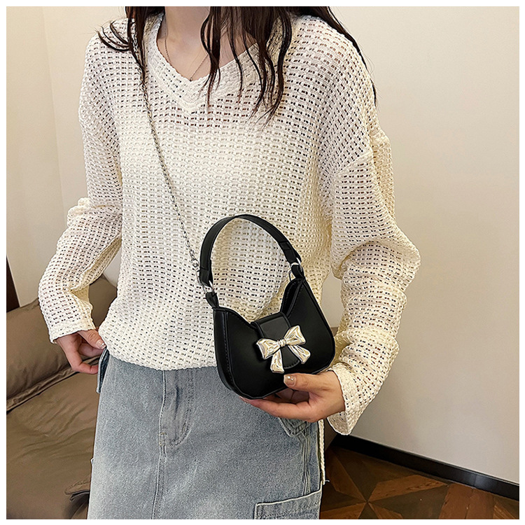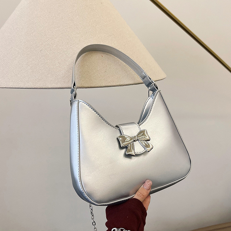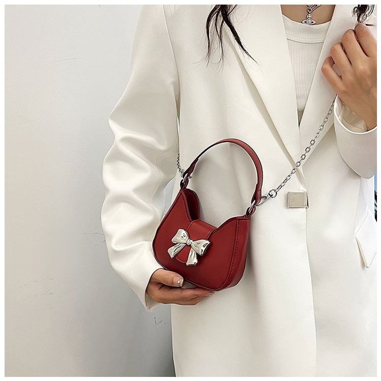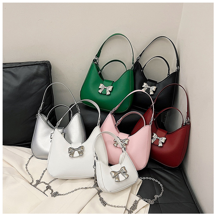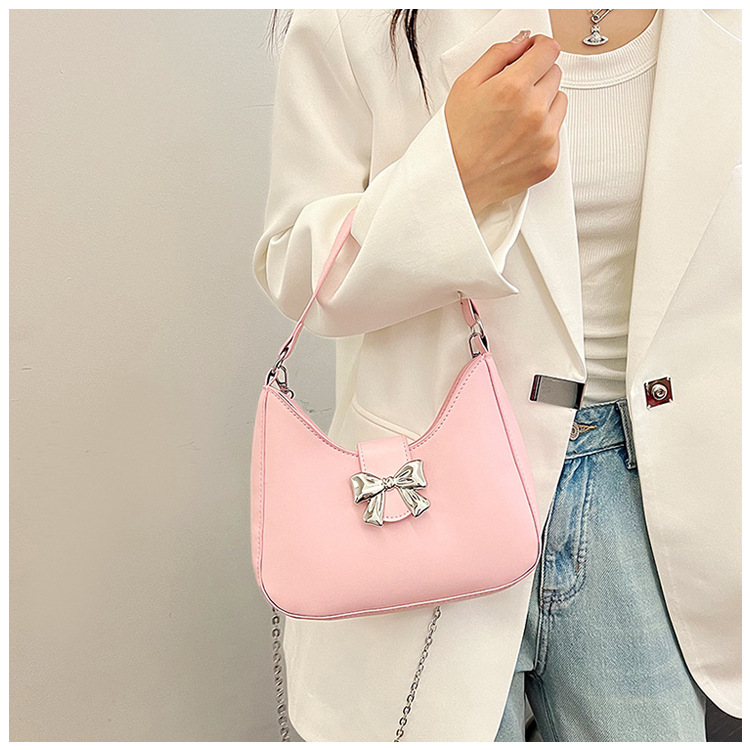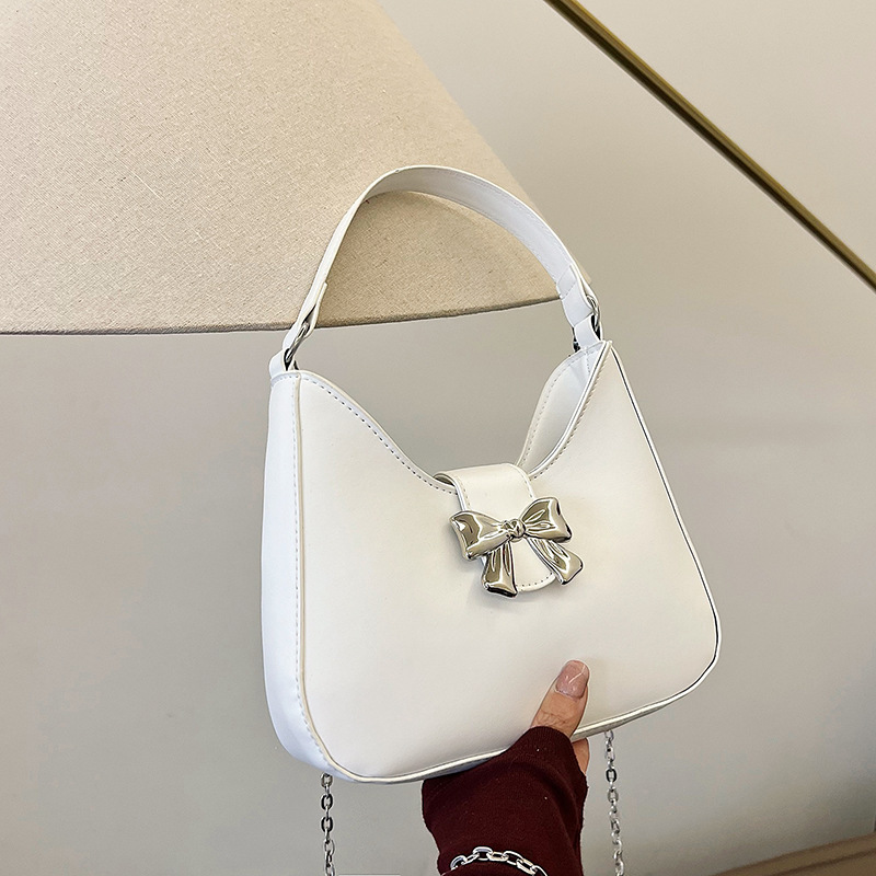 • 甘いソリッドカラーの弓ハンドバッグの女性 2024 新しいトレンディなファッションニッチ脇の下バッグチェーンクロスボディバッグ