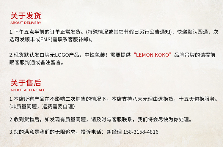 弊社が取り扱っている商品は、自社の海外工場から直送しています。ご入金が確認でき次第に商品を発送いたします。ご注文殺到時や、ご注文数量、種類が多い場合は、発送が遅れる可能性がございます、ご了承ください。ご注文商品の中に在庫がない商品につき、その商品のみキャンセルさせていただき、在庫のある商品のみをまとめて発送させていただきます。また、ご注文後の商品追加や、内容変更、同梱などはお受付しておりません。