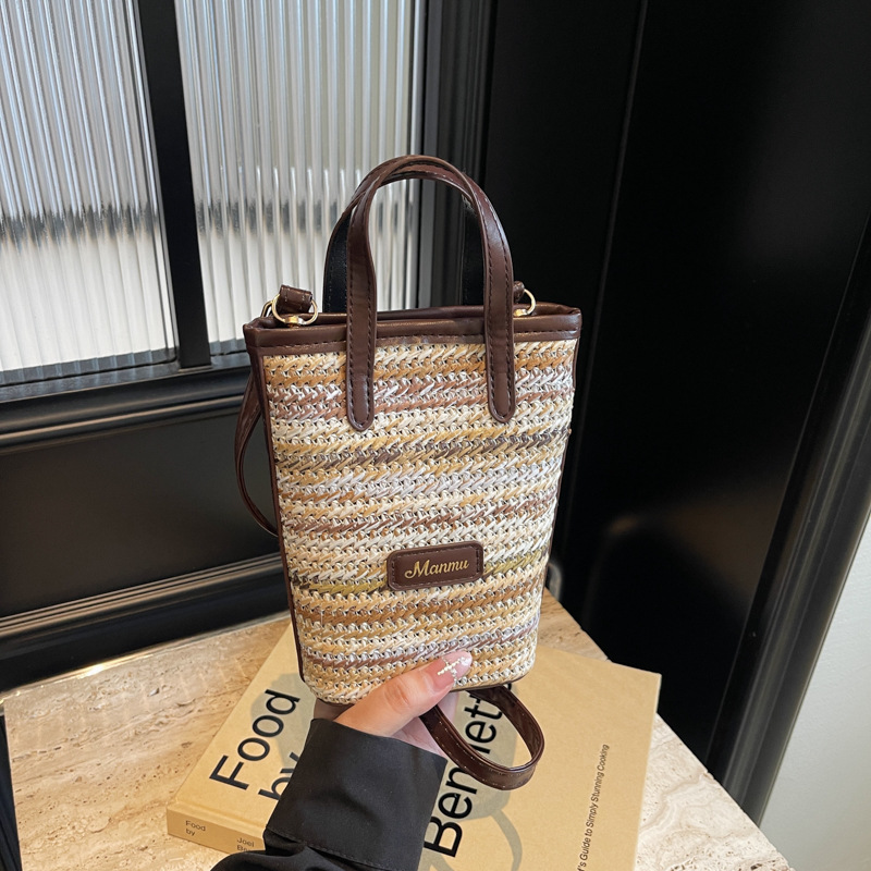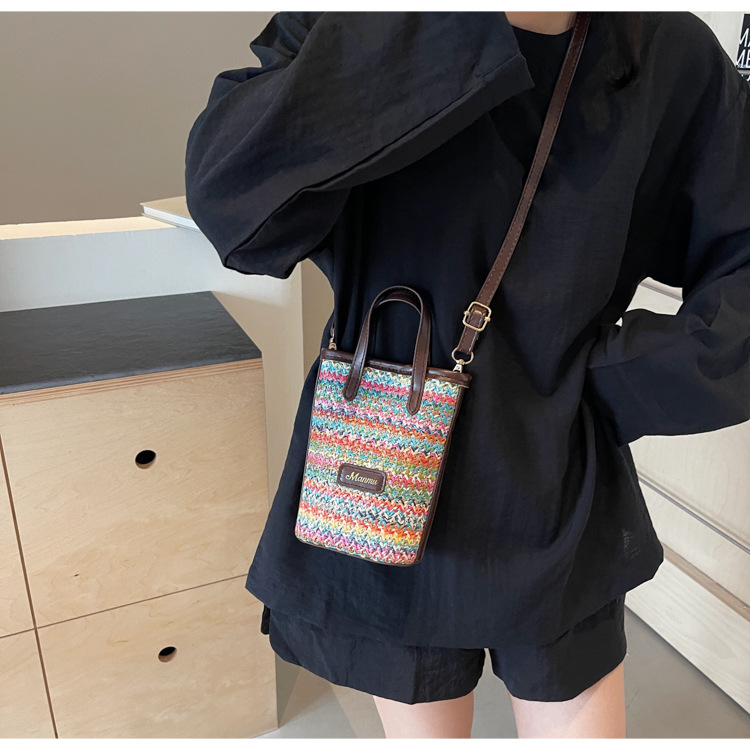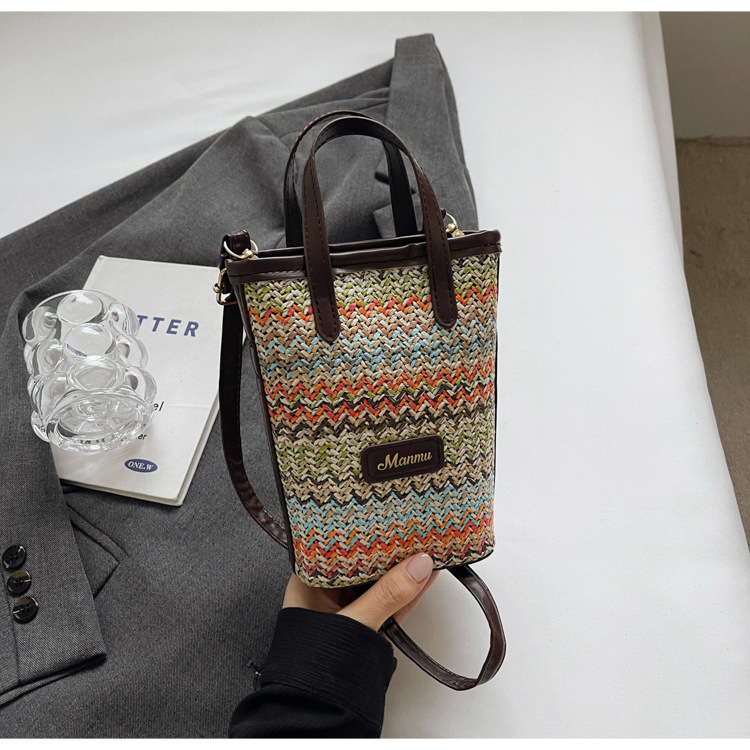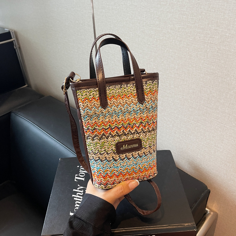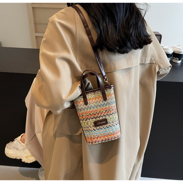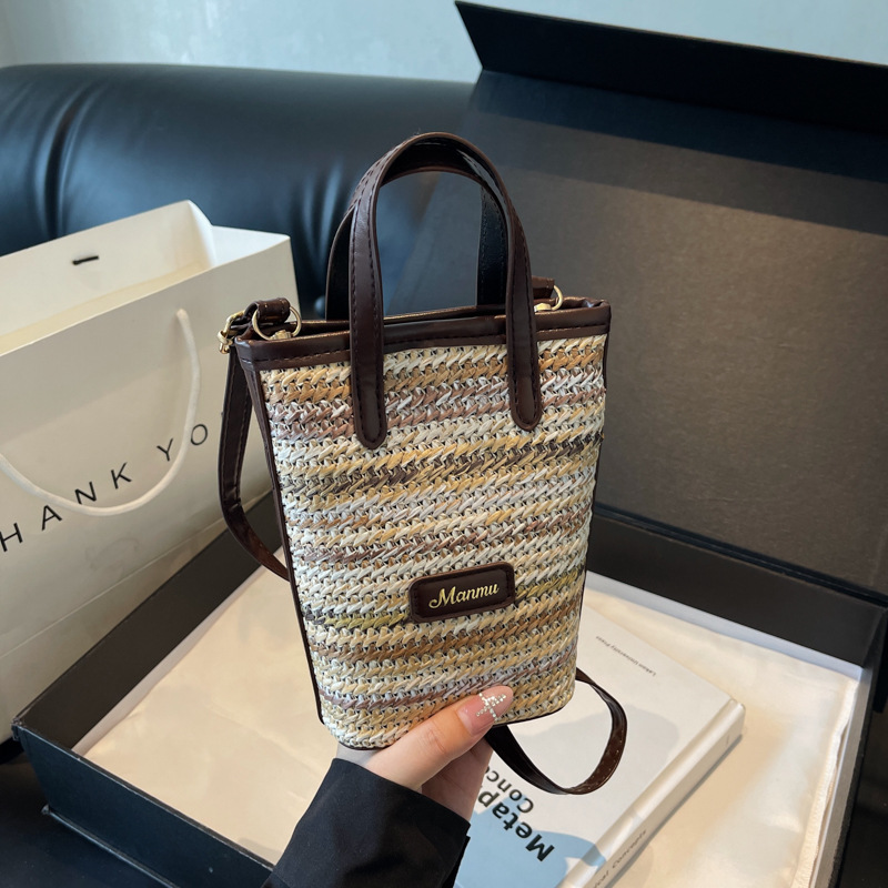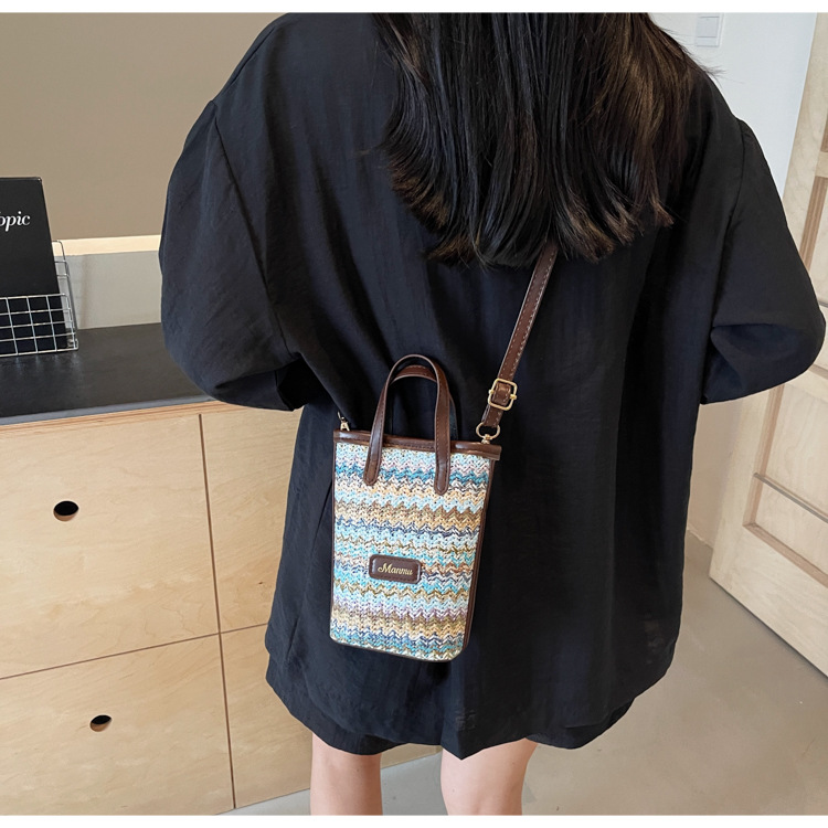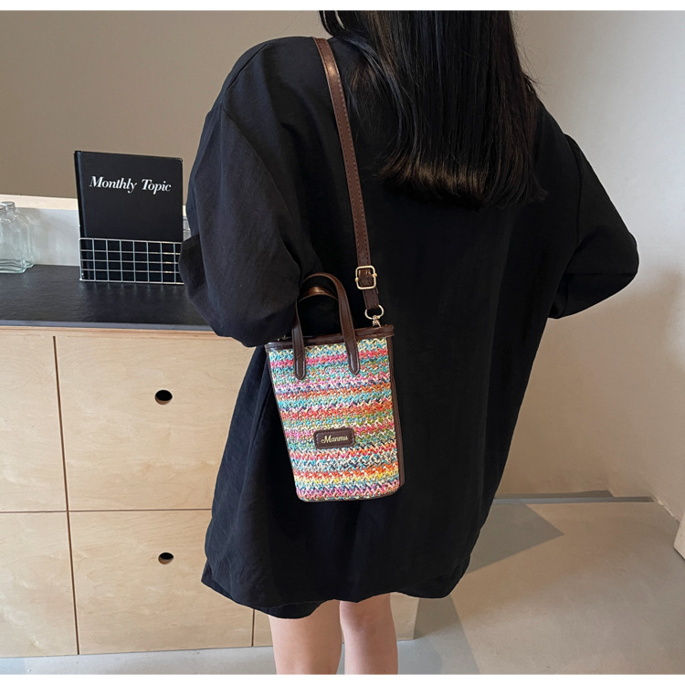 • 絶妙なミニスーパーホットスモールバッグ女性 2024 新しい人気のコントラストカラーわらバケツバッグ多用途クロスボディ携帯電話バッグ