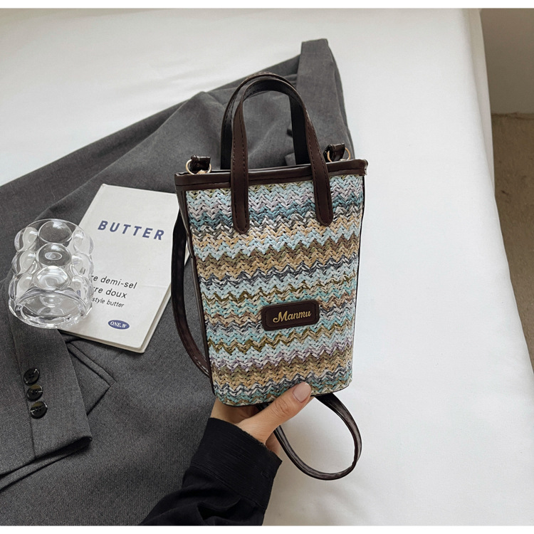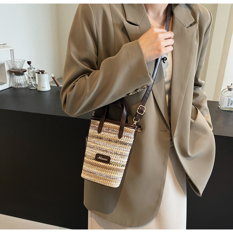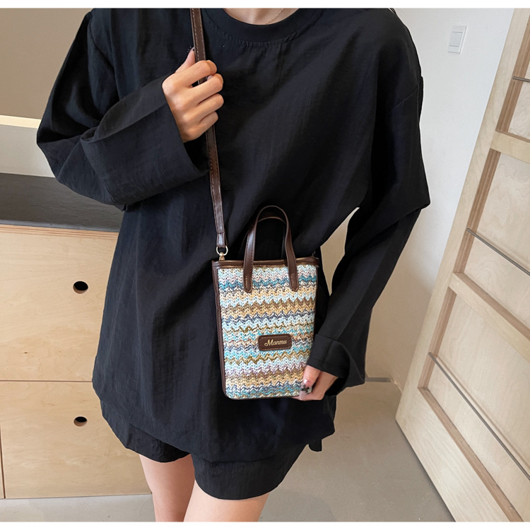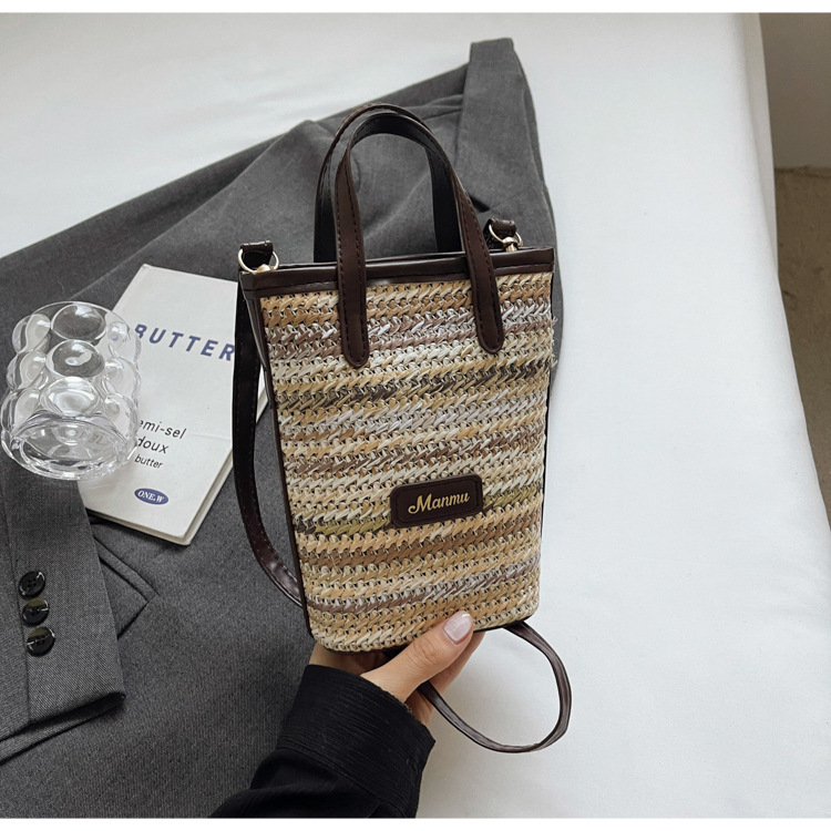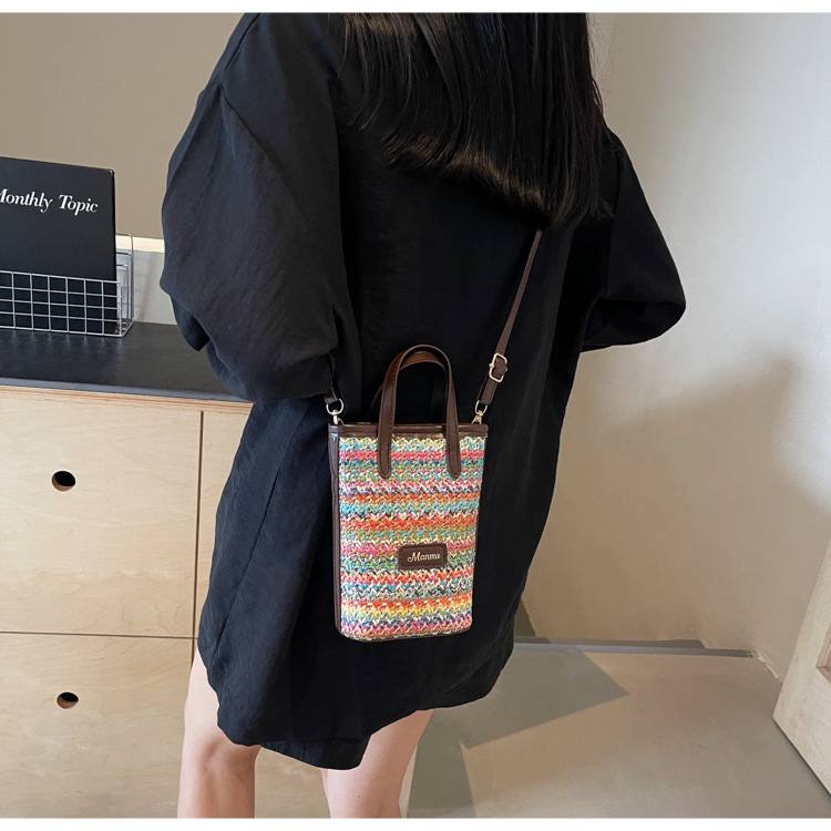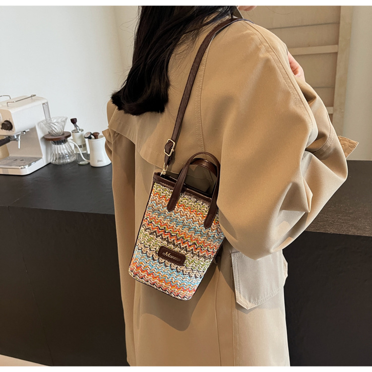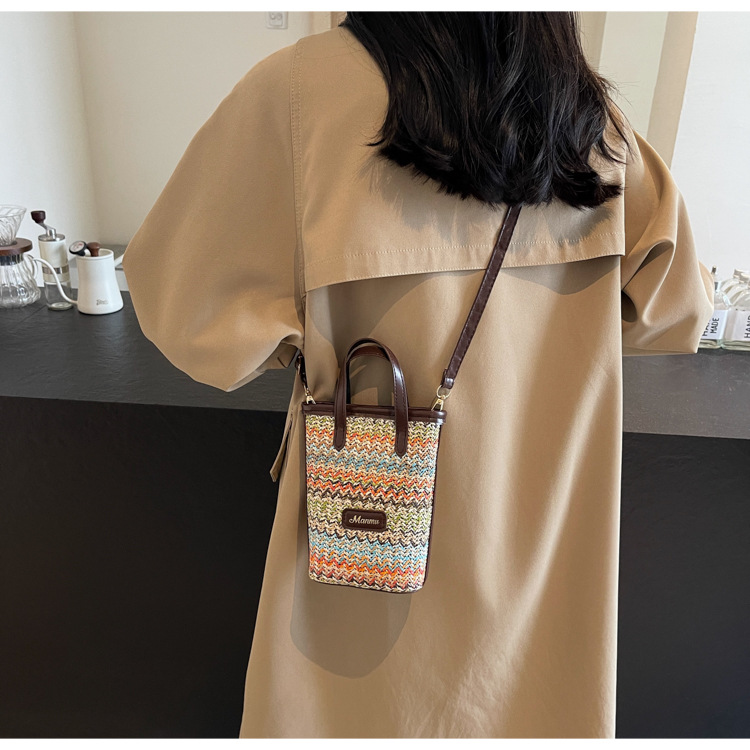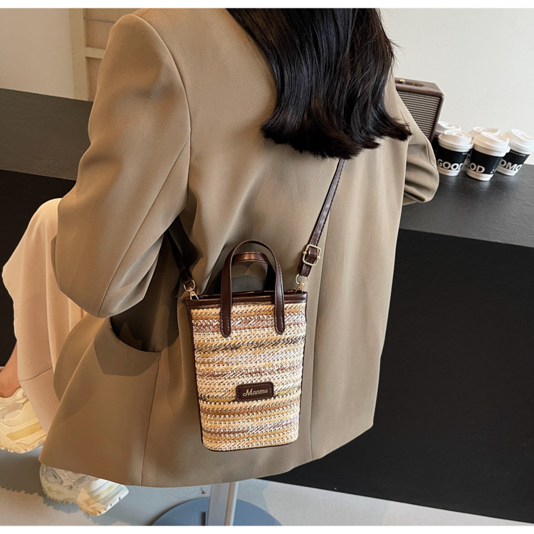 • 絶妙なミニスーパーホットスモールバッグ女性 2024 新しい人気のコントラストカラーわらバケツバッグ多用途クロスボディ携帯電話バッグ