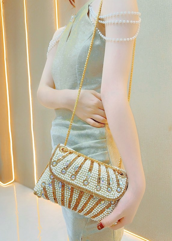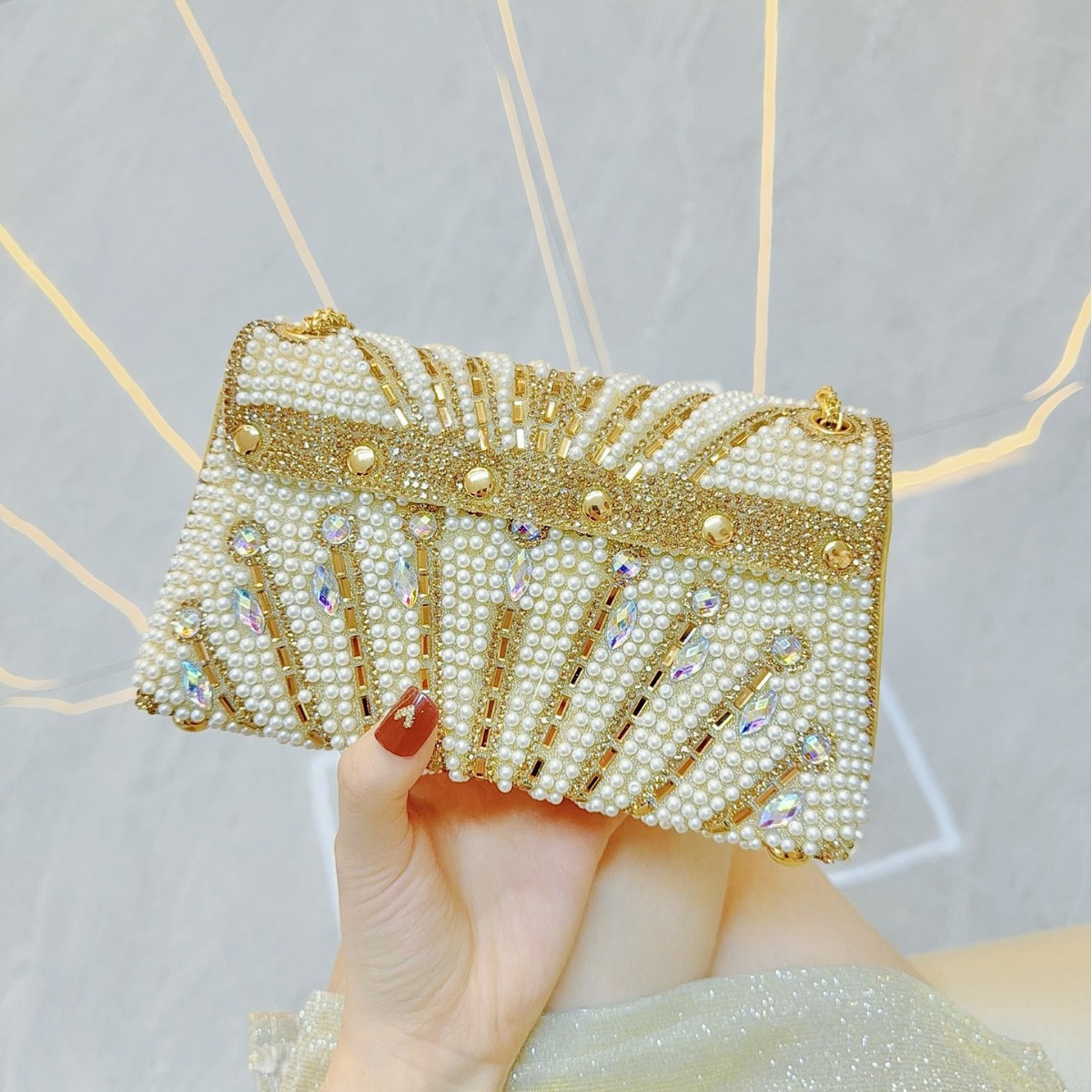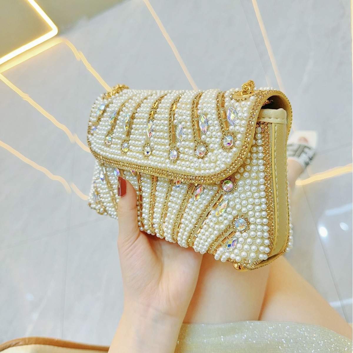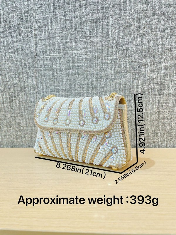 • 新しい手作りのパール脇の下バッグ、バンケットラインストーンの小さな正方形バッグ、クラッチバッグ、ワンショルダークロスボディイブニングバッグ