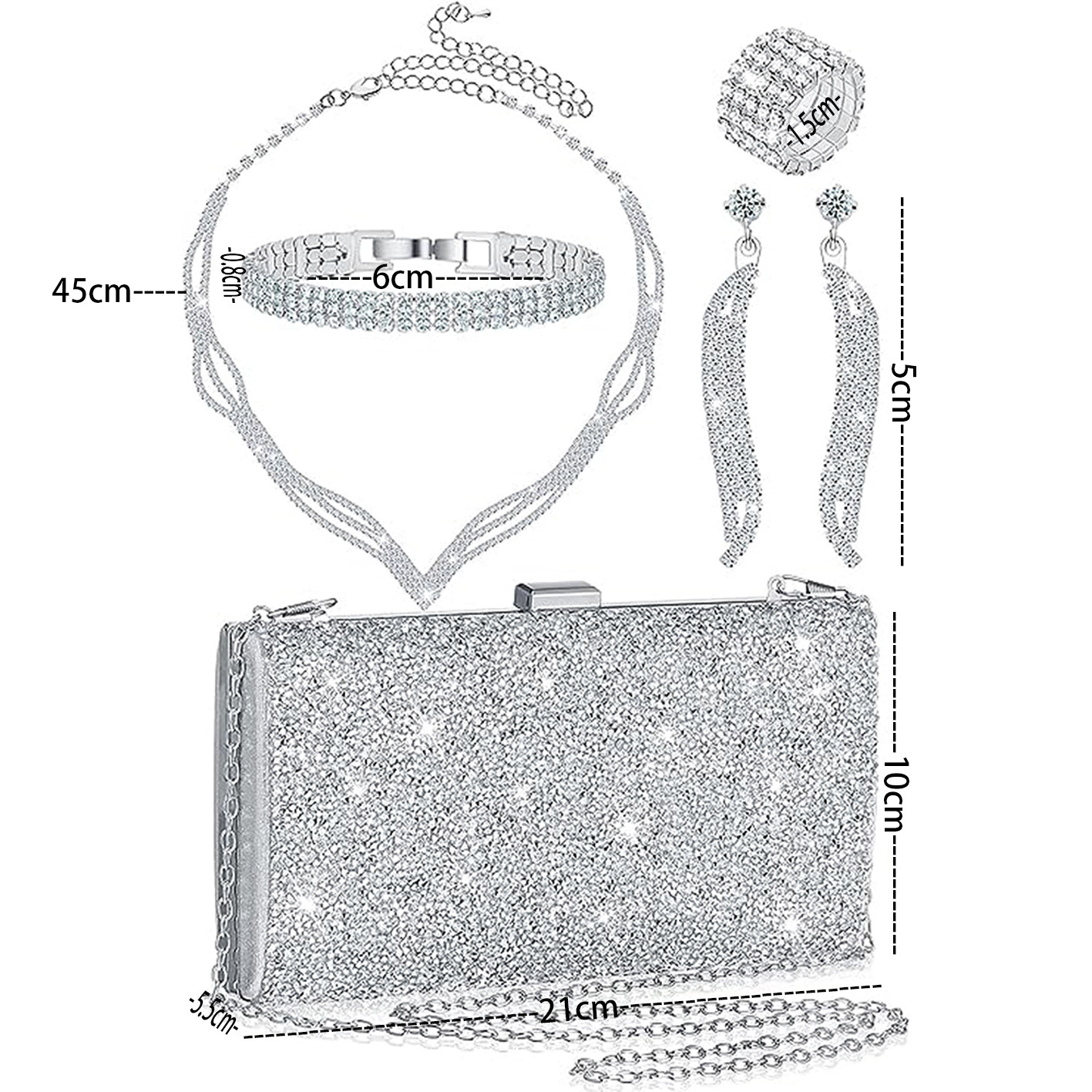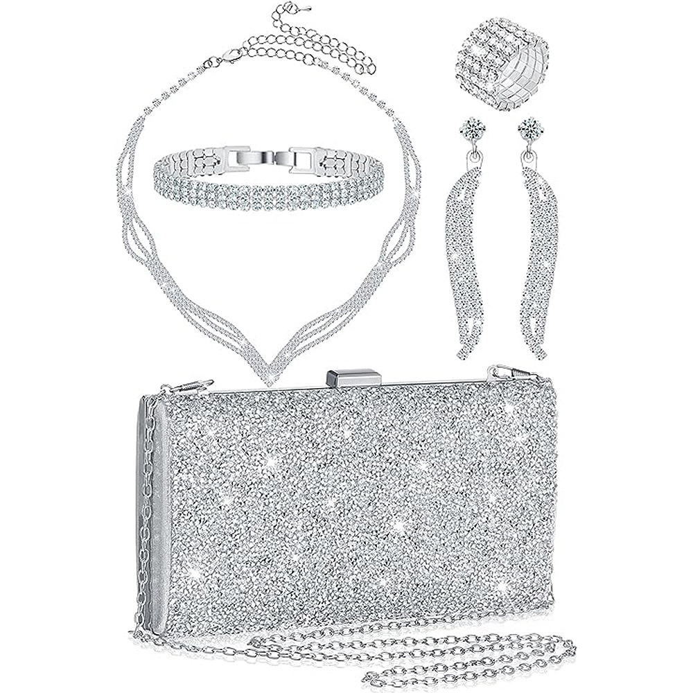 • ファッショナブルなブライダルライト高級5ピーススーツ、まばゆいネックレス、リング、ブレスレット、イヤリング、イブニングバッグ